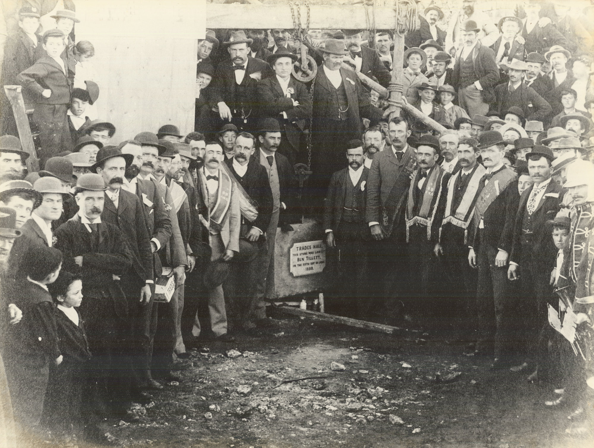 Ben Tillett laying the foundation stone at Trades Hall, Broken Hill, NSW, 1898 (5th June 1898), [BJFSM0299]. Living Histories, accessed 14/04/2026, https://livinghistories.newcastle.edu.au/nodes/view/114362