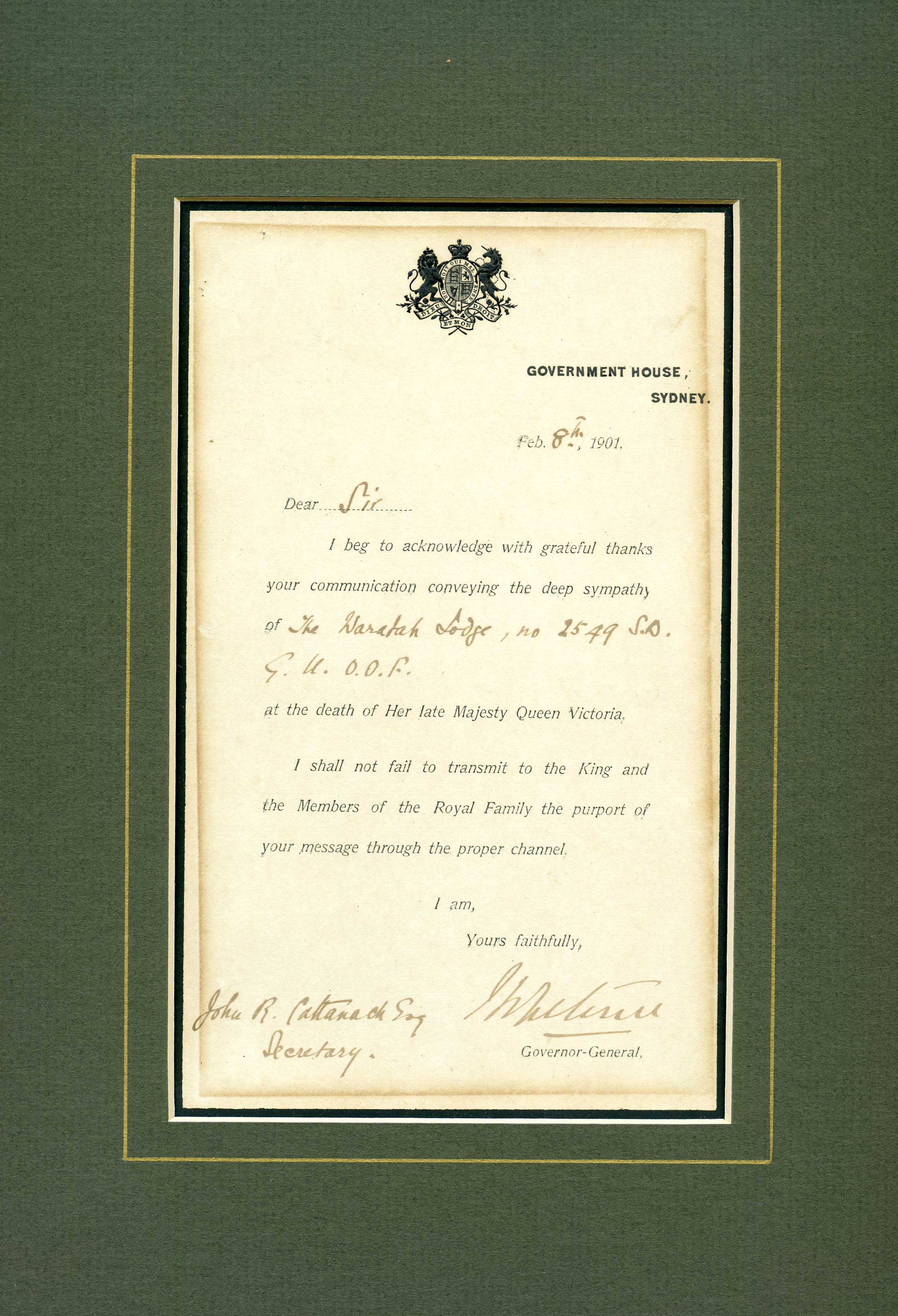 Letter to Waratah Lodge G.U.O.O.F from Government House, Sydney, 1901