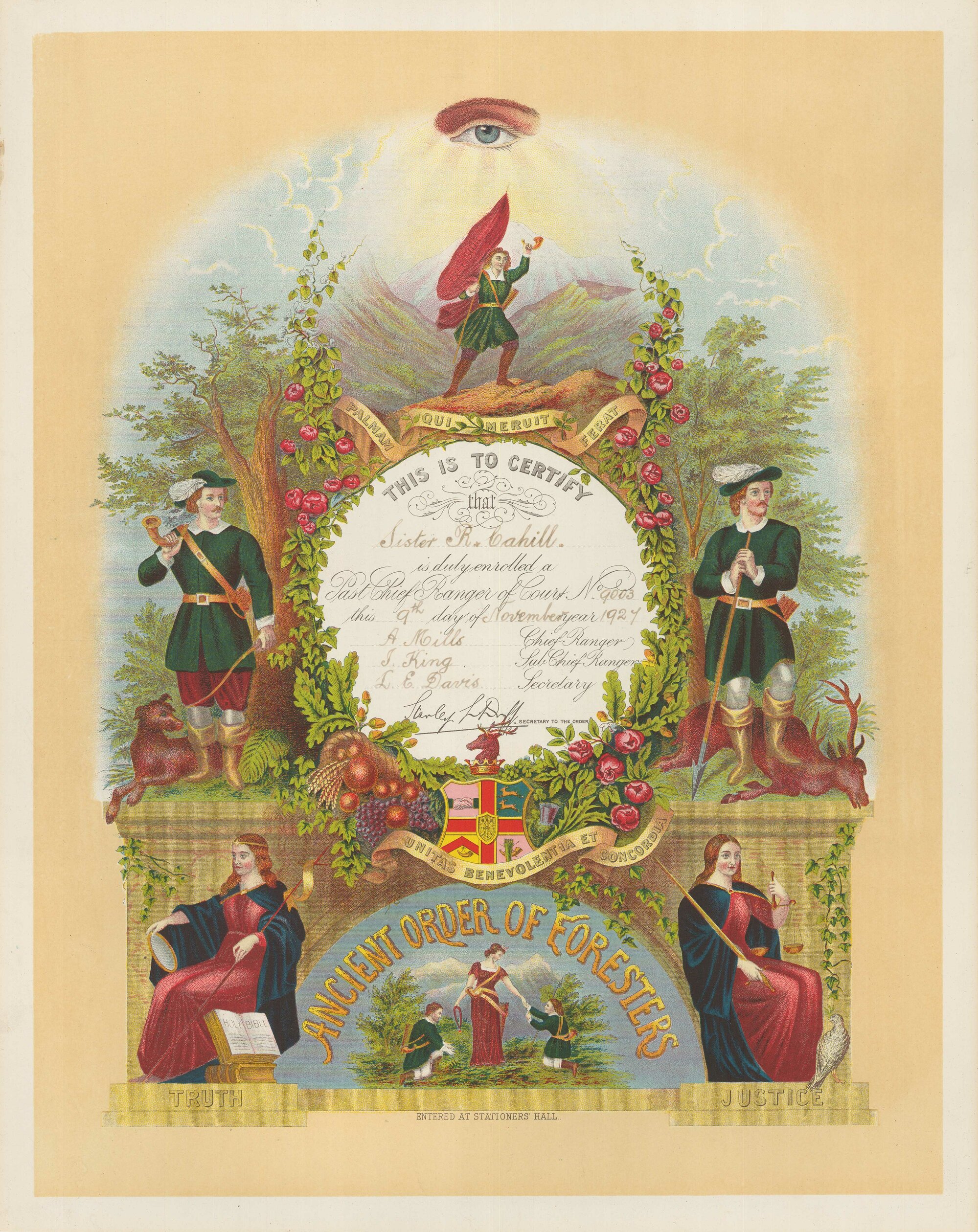 Certificate, Sister R Cahill, PCR, Court No 9003, Ancient Order of Foresters, 1927