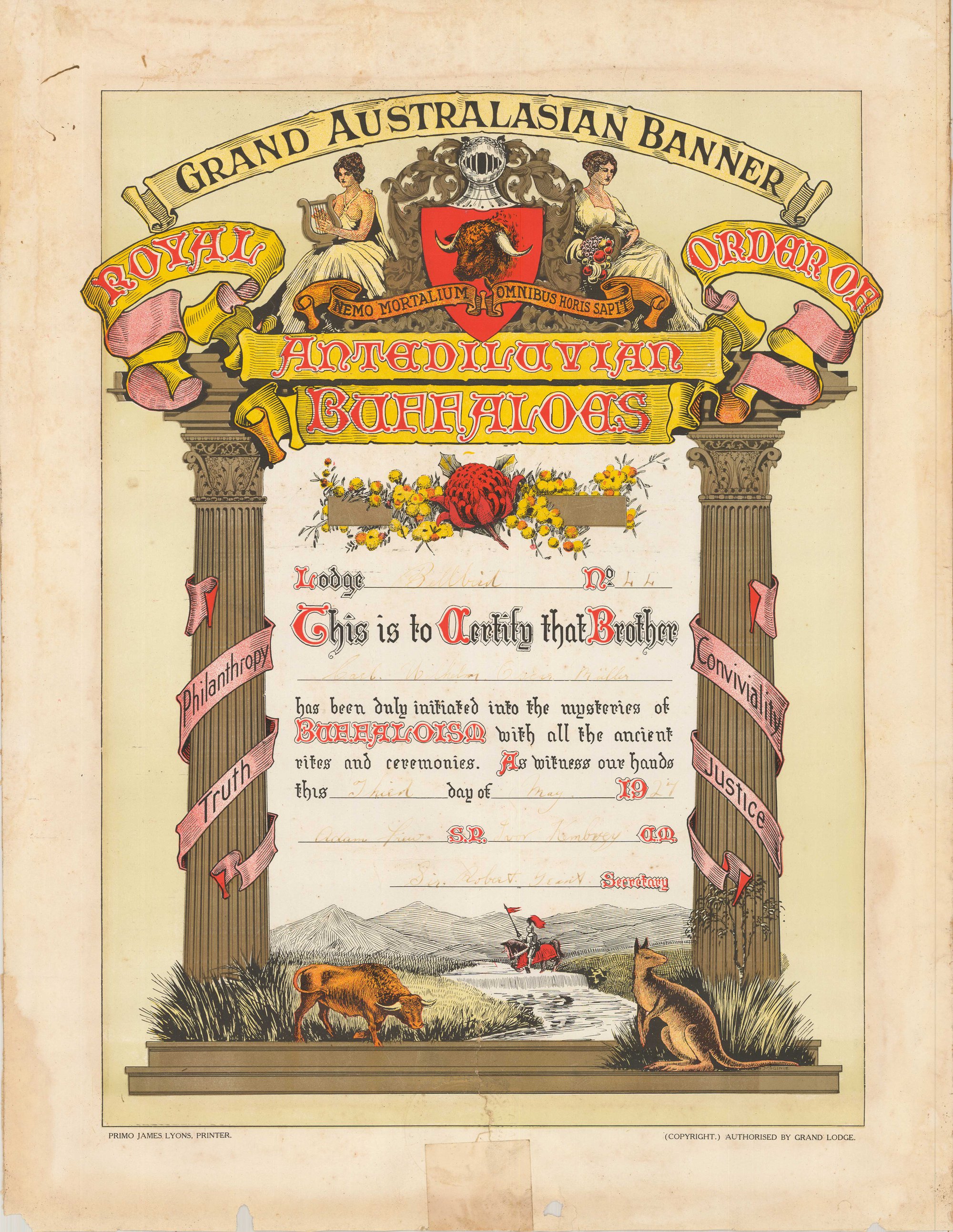 Primo James Lyons, Printer, Certificate, Carl Miller, Lodge Bellbird, R A O B, GAB, 1927 (3rd May 1927), [BJFSM0310]. Living Histories, accessed 01/05/2026, https://livinghistories.newcastle.edu.au/nodes/view/114374