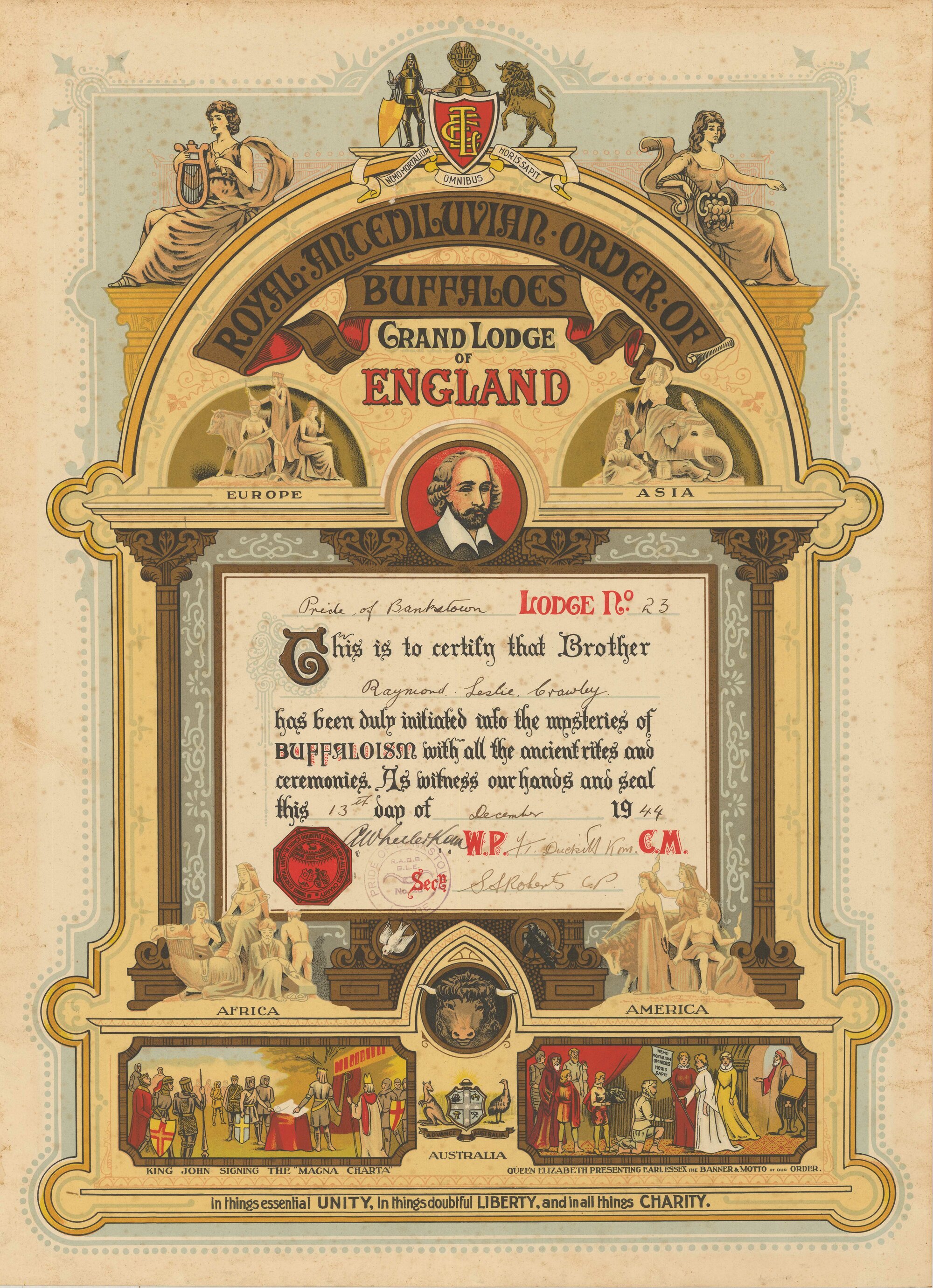 Certificate, Raymond Leslie Crawley, Pride of Bankstown Lodge No. 23, R.A.O.B., 1944