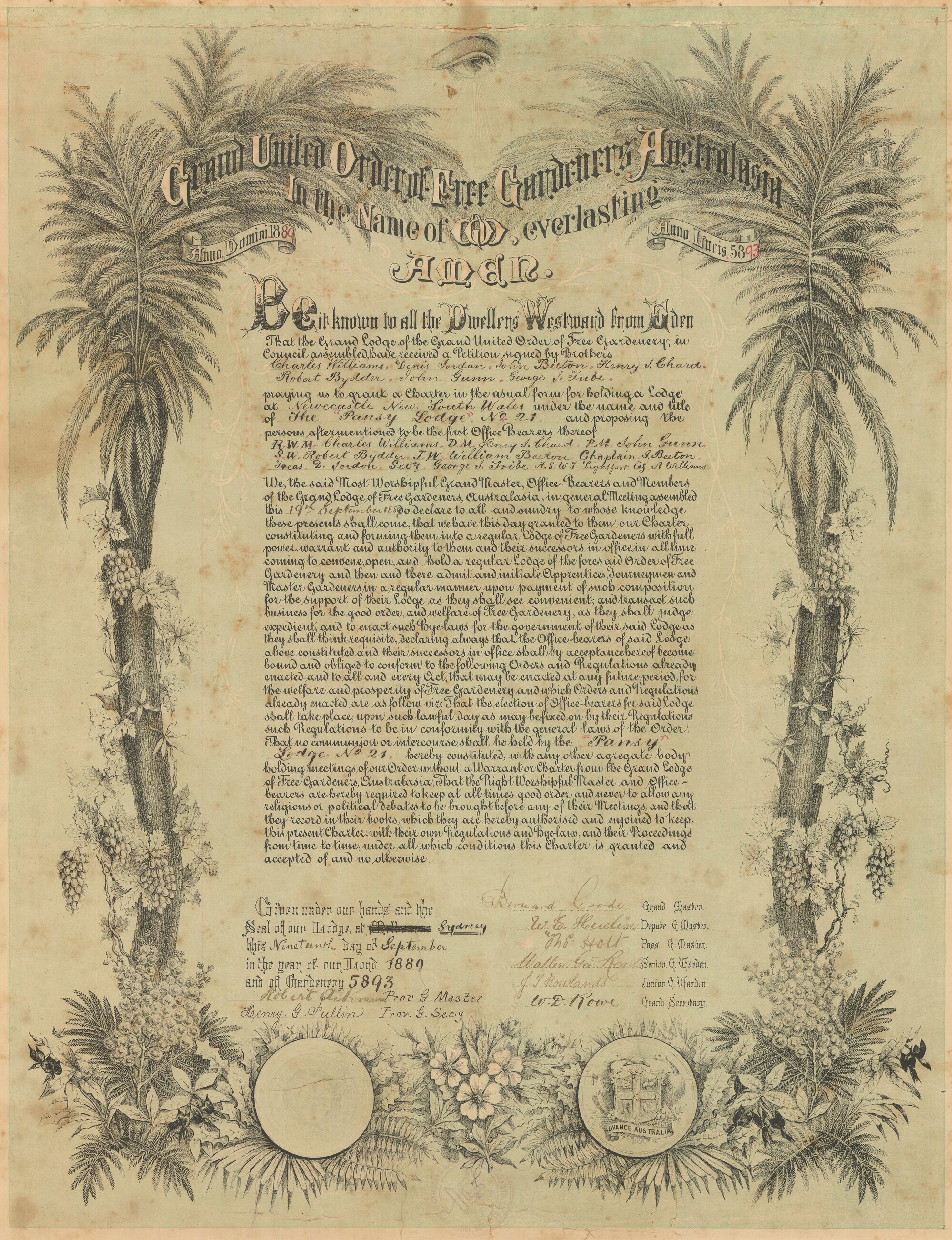 Dispensation for Pansy Lodge No. 21, Grand United Order of Free Gardeners, Newcastle, NSW, 1889