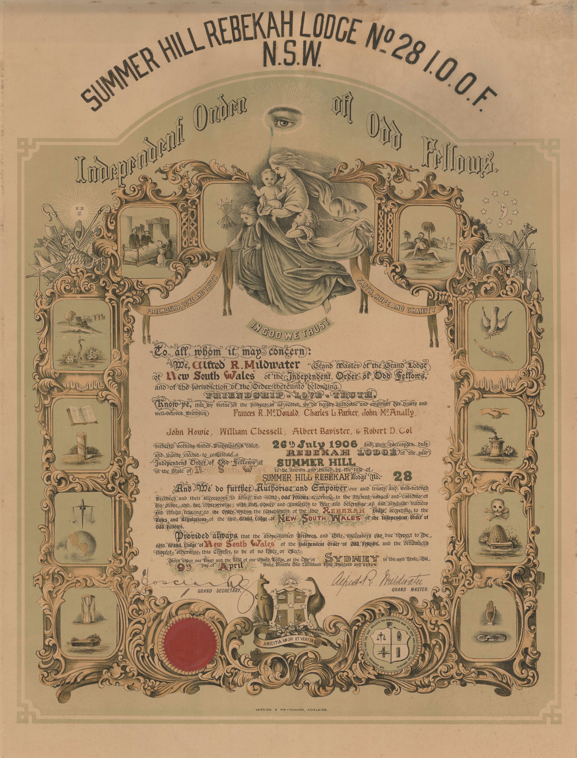 Vardon and Pritchard, Adelaide, Dispensation for the Summer Hill Rebekah Lodge No. 28, I.O.O.F., 1906 (9th April 1907), [BJFSM0425]. Living Histories, accessed 02/04/2026, https://livinghistories.newcastle.edu.au/nodes/view/114489