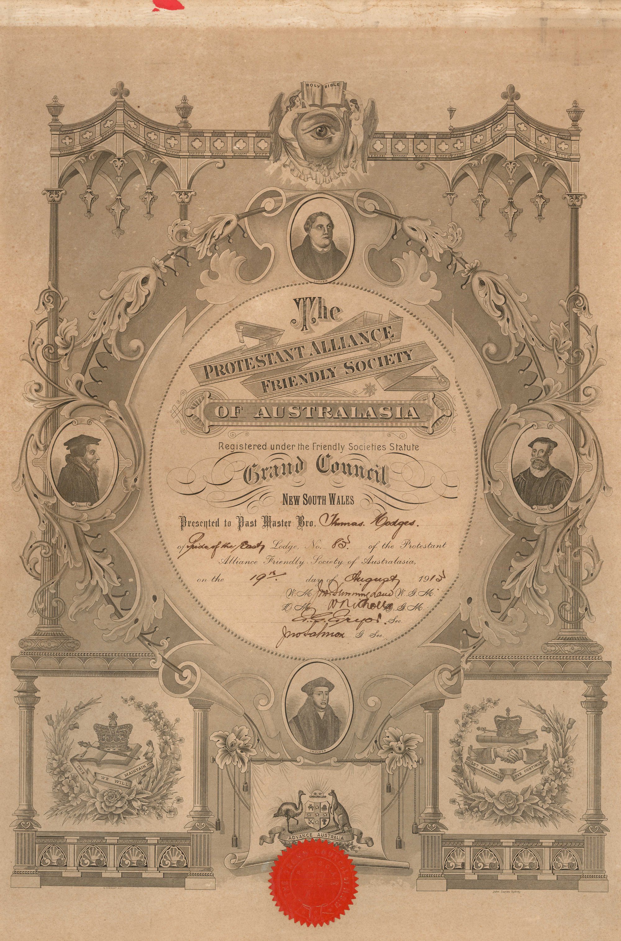 Q Tarrant Sc, John Sands Sydney, Thomas Hodges of Pride of the East Lodge No. 83, P.A.F.A of Australasia, 1913 (19th August 1913), [BJFSM0466]. Living Histories, accessed 09/03/2026, https://livinghistories.newcastle.edu.au/nodes/view/114529