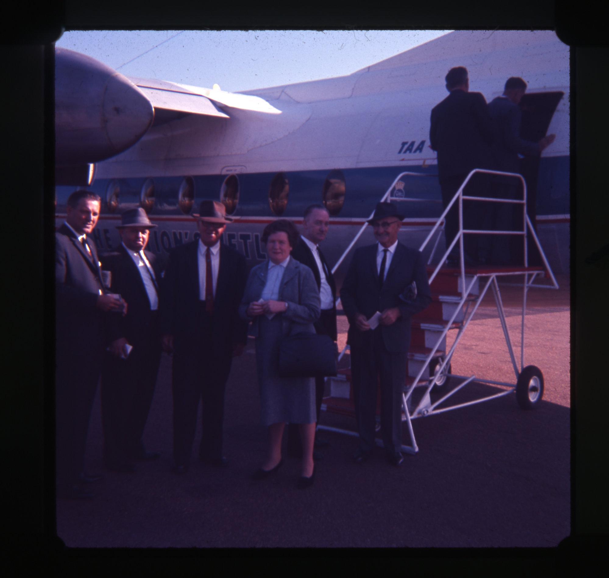 Merv and Janet Copley, WWF [Waterside Workers Federation] pensioner deputation entering plane at Williamtown, NSW, 1965 (1965), [Copley_0361]. Living Histories, accessed 13/03/2026, https://livinghistories.newcastle.edu.au/nodes/view/115117