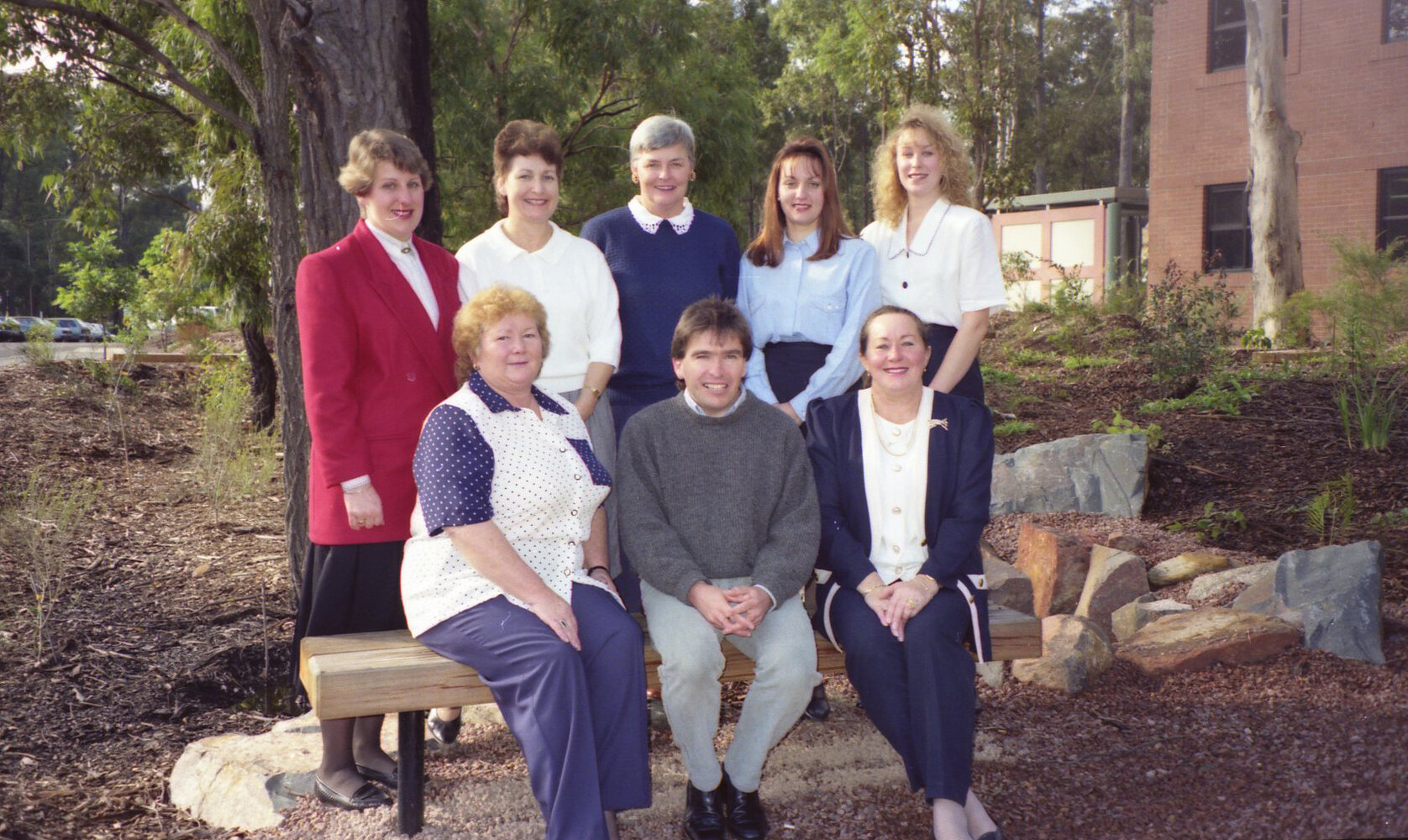 David Marr with unidentified staff from the Student Division Unit outside the Chancellery Building, the University of Newcastle, Australia - 1992