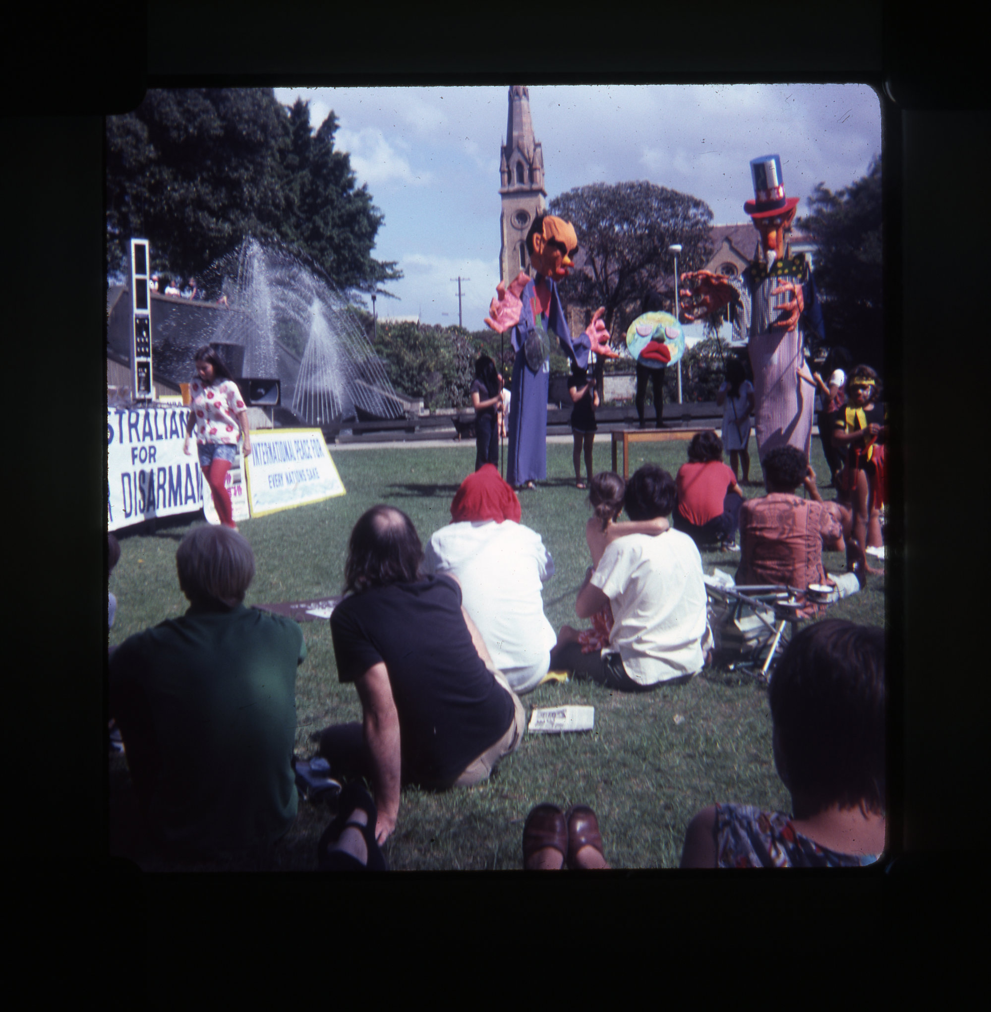 Merv and Janet Copley, Political puppets, International Peace Day, Civic Park, Newcastle, NSW, 1983 (1983), [Copley_3256]. Living Histories, accessed 15/04/2026, https://livinghistories.newcastle.edu.au/nodes/view/115576