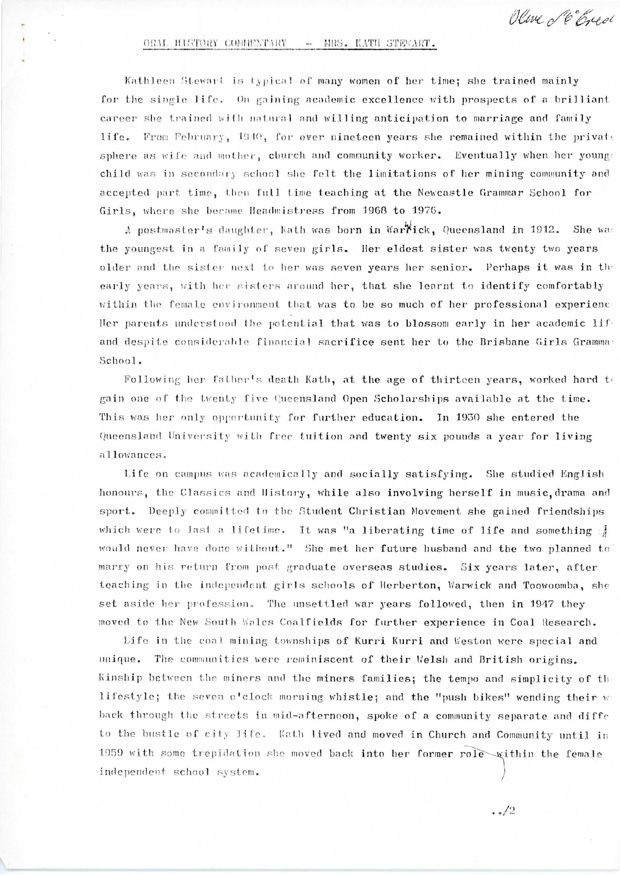 Interview summary: Kathleen Stewart, life as an educator, 29 September 1986 (1986-09-29), [A6732 (39)_Olive Mcrae]. Living Histories, accessed 02/04/2026, https://livinghistories.newcastle.edu.au/nodes/view/116809