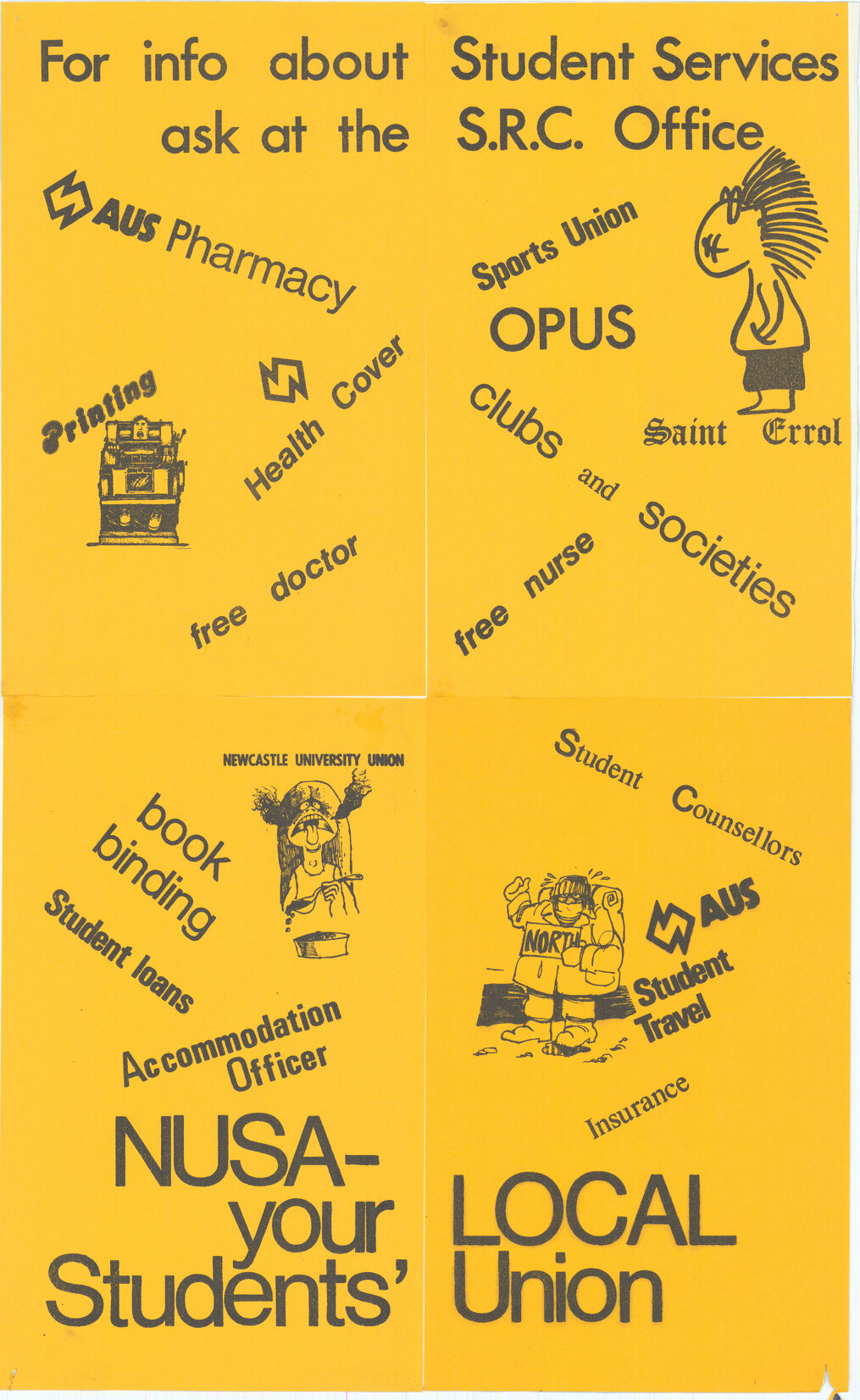 Poster "Student Services NUSA" ([n.d.]), [University-Posters-0070-Student-Services]. Living Histories, accessed 16/04/2026, https://livinghistories.newcastle.edu.au/nodes/view/116889