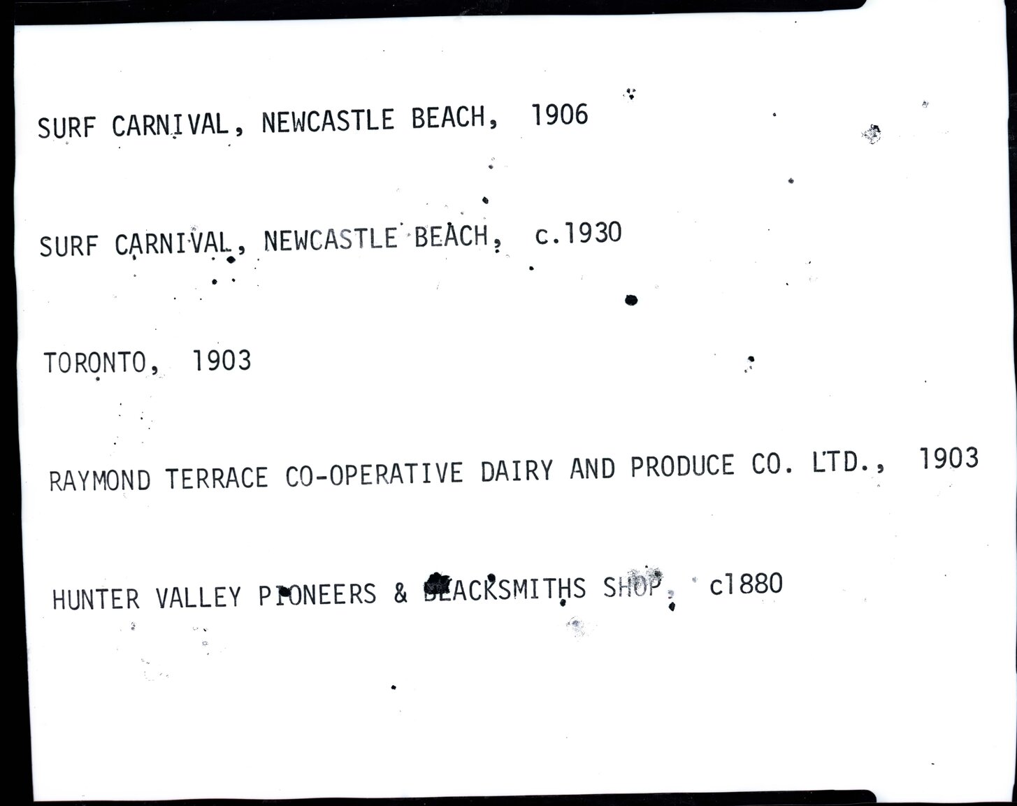 Hannan Photographics (1958-2011), Label with place names and events, including Surf Carnival Newcastle Beach, 1906 (27th September 1963), [AHAN00640]. Living Histories, accessed 05/04/2026, https://livinghistories.newcastle.edu.au/nodes/view/117122