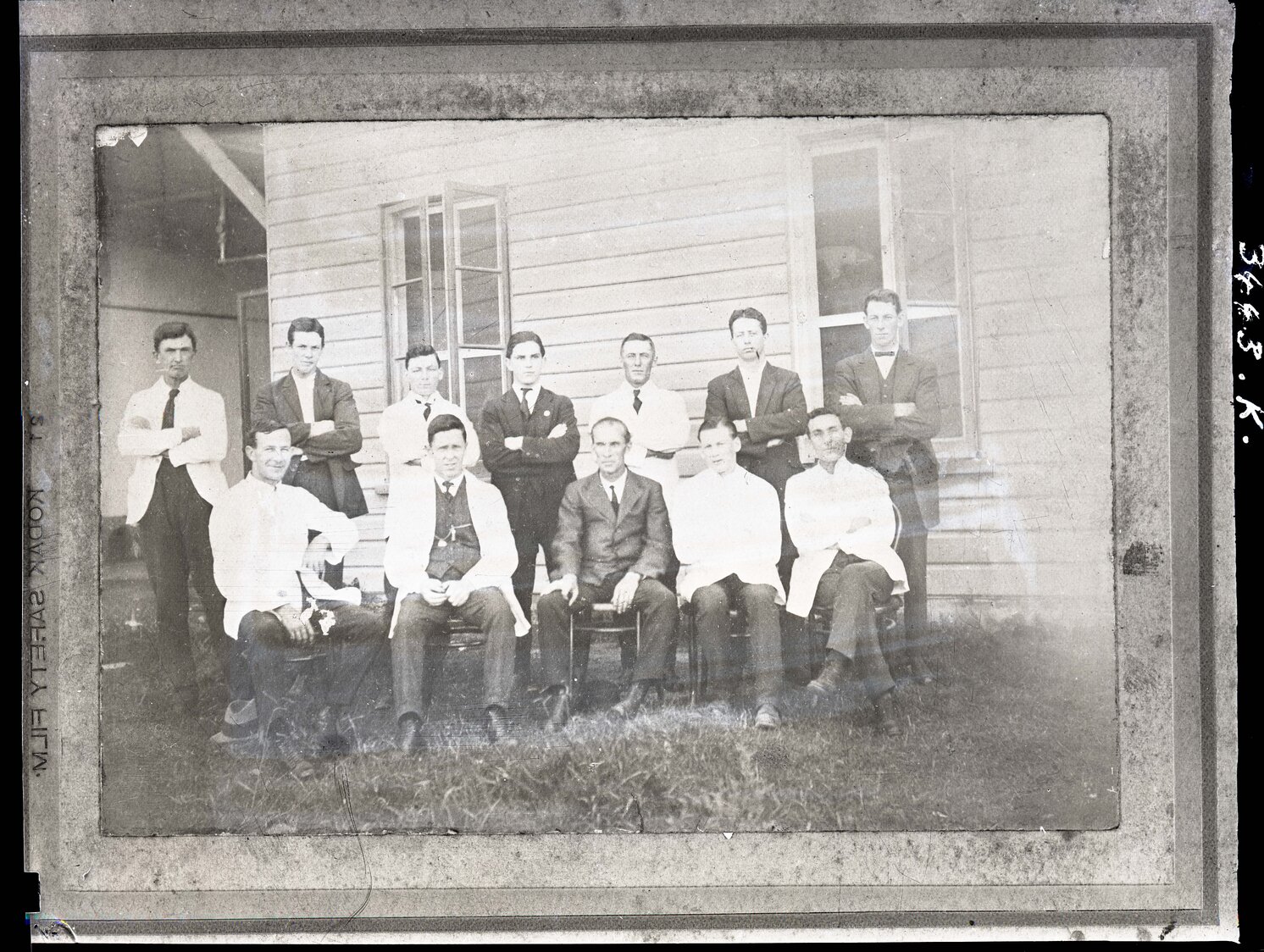 Men sitting and standing outside building in lab coats, Hunter Valley Dairy Co. [n.d.]