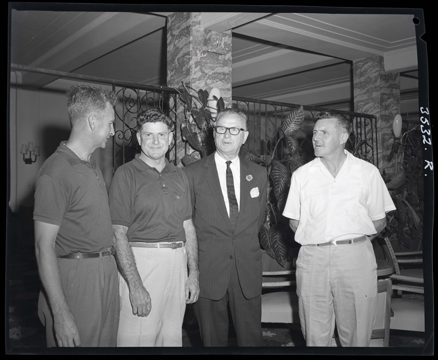 Hannan Photographics (1958-2011), Coal and Allied Golf Day at Bonnie Doon, 1963, four men indoors (28th November 1963), [AHAN00832]. Living Histories, accessed 25/01/2026, https://livinghistories.newcastle.edu.au/nodes/view/117314