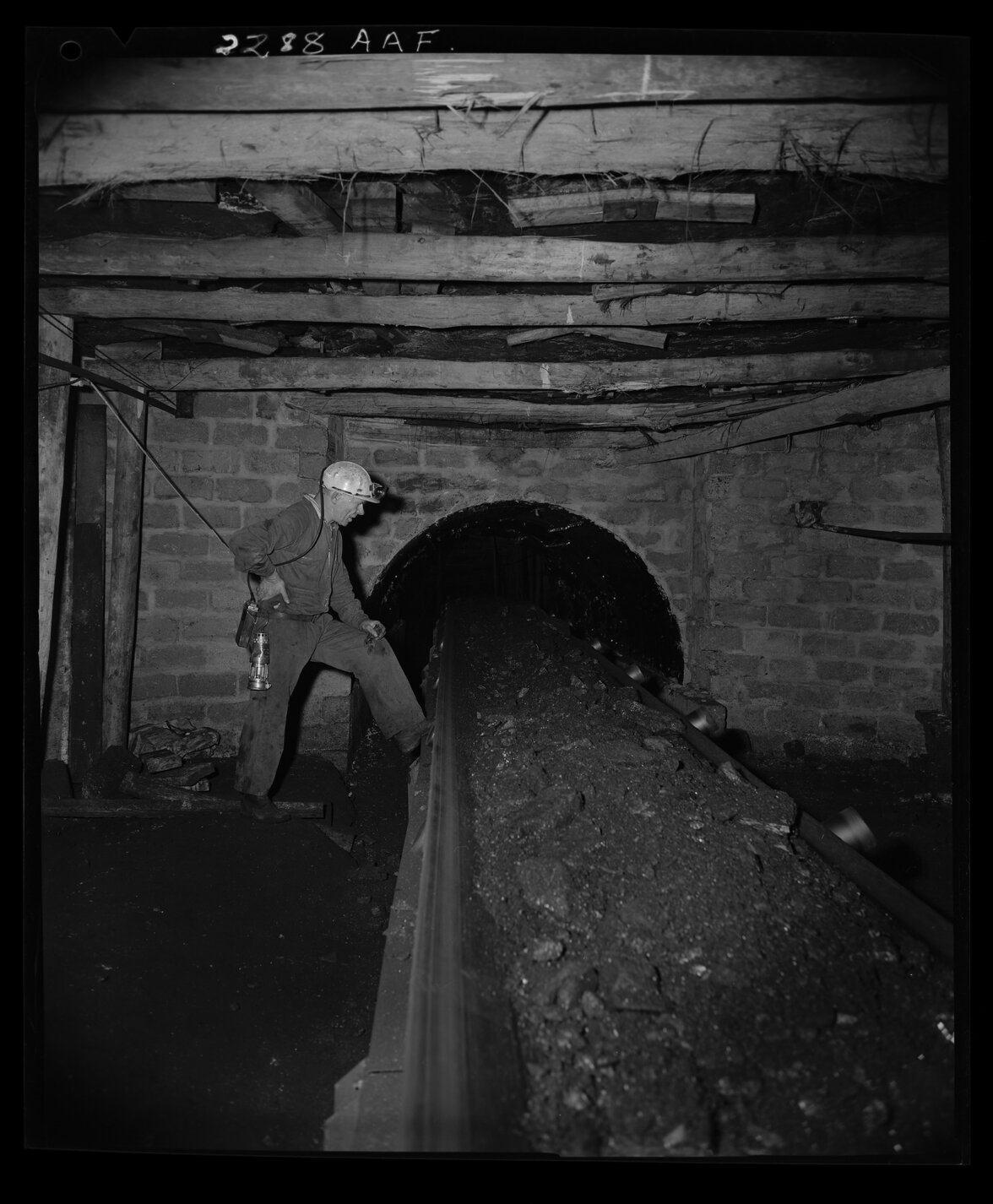 Green Leaves Studio (1955-1963), Bellambi Colliery, miner and conveyor belt, 1961 (28th December 1961), [AHAN01029]. Living Histories, accessed 17/01/2026, https://livinghistories.newcastle.edu.au/nodes/view/117532