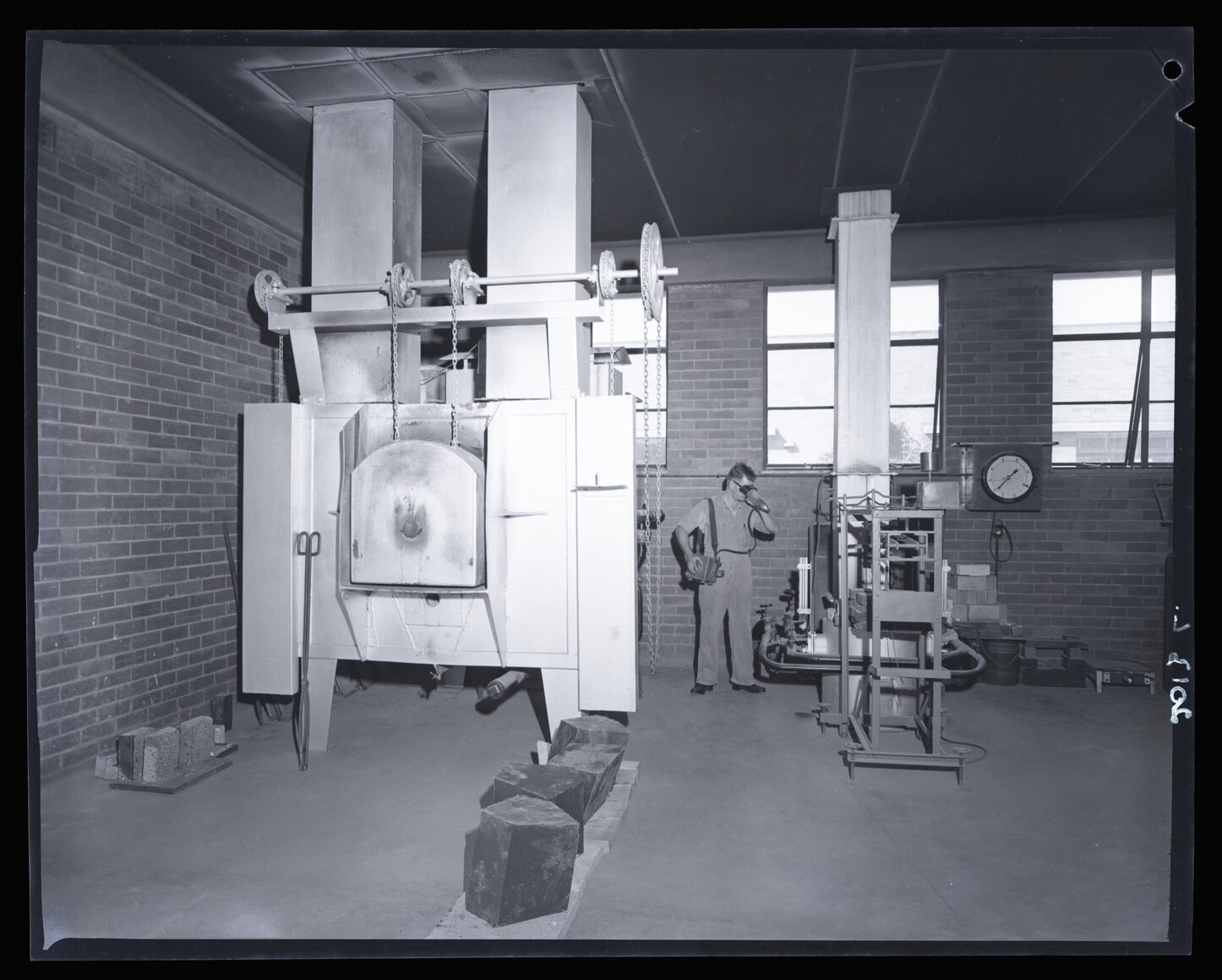 Green Leaves Studio (1955-1963), Newbold General Refractories, man with machinery, 1961 (17th April 1961), [AHAN01075]. Living Histories, accessed 19/01/2026, https://livinghistories.newcastle.edu.au/nodes/view/117578