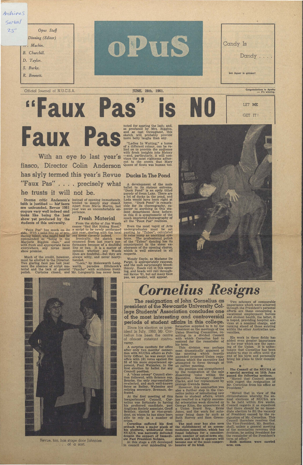 Newcastle University College Students' Association, OPUS Official Journal of N.U.C.S.A. June 26th, 1961. (26th June 1961), [Archives Serial 25]. Living Histories, accessed 25/01/2026, https://livinghistories.newcastle.edu.au/nodes/view/118167