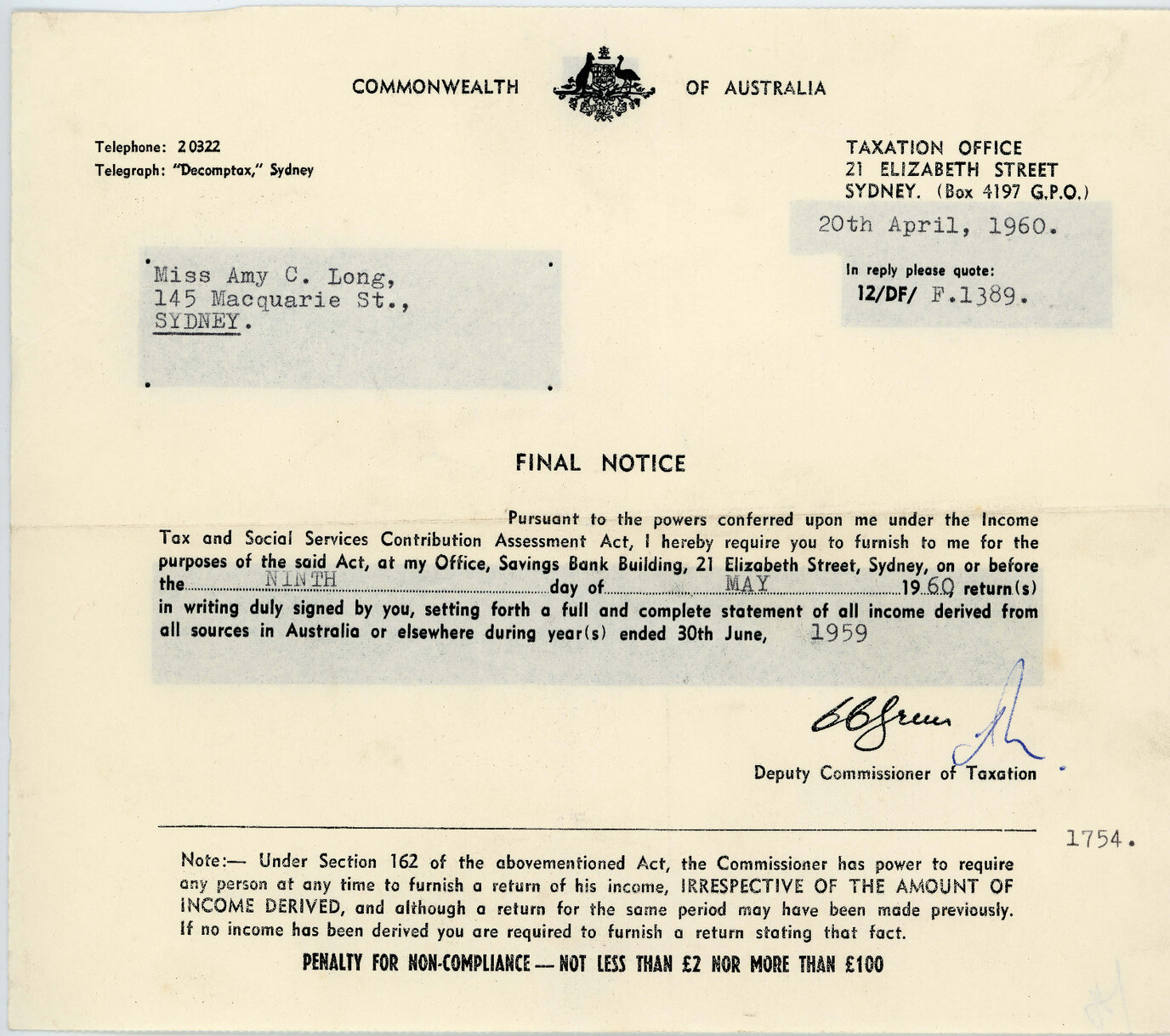 Deputy Tax Commissioner, Final Tax Notice to Amy Long, 20 April 1960 (20th April 1960), [TN19600420]. Living Histories, accessed 01/04/2026, https://livinghistories.newcastle.edu.au/nodes/view/118651