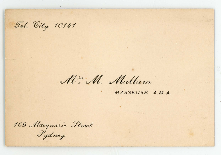 [Mary Long], Mary Long "Mrs M Mallam" masseuse business card, undated ([n.d.]), [BCUNDATED]. Living Histories, accessed 01/04/2026, https://livinghistories.newcastle.edu.au/nodes/view/118659