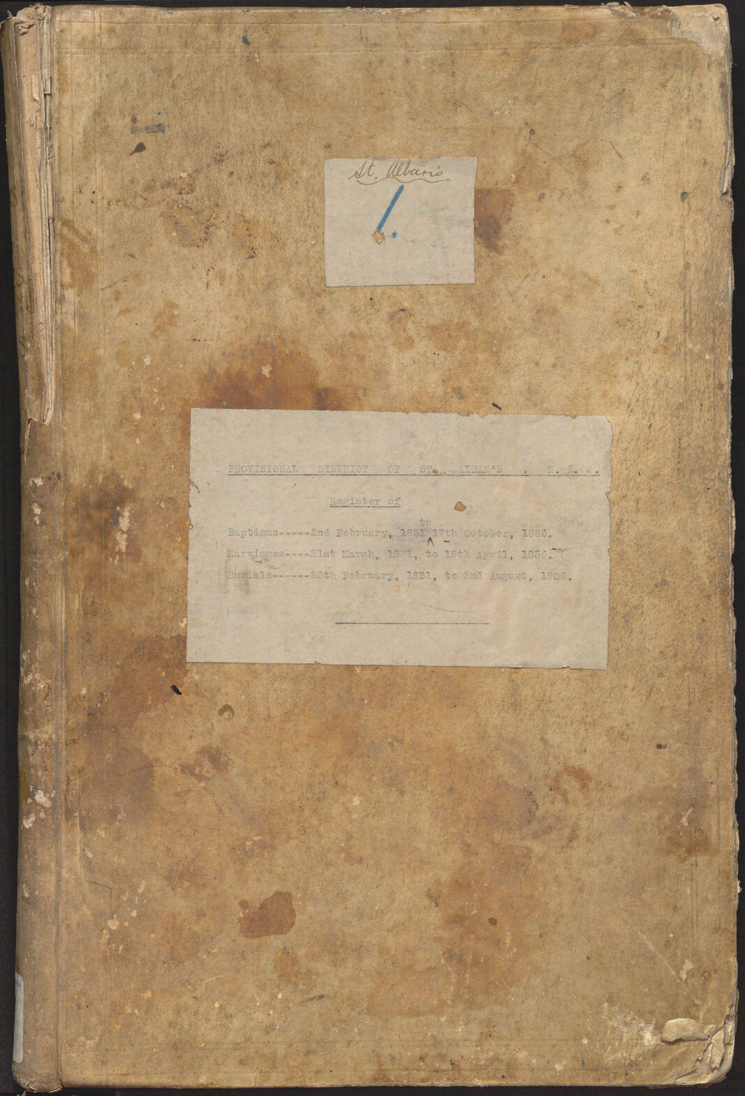 St Alban's Anglican Church (Lower Hawkesbury) Register of Baptisms (1831-1886), Marriages (1831-1856), Burials (1831-1906)