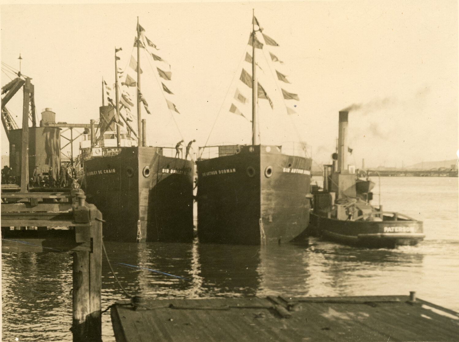Walsh Island Dockyard, 'Sir Arthur Dorman' being fitted out next to 'Sir Dudley De Chair' (Left) and Tug 'Paterson' (Right) (1925), [2006-001-01]. Living Histories, accessed 22/04/2026, https://livinghistories.newcastle.edu.au/nodes/view/119122