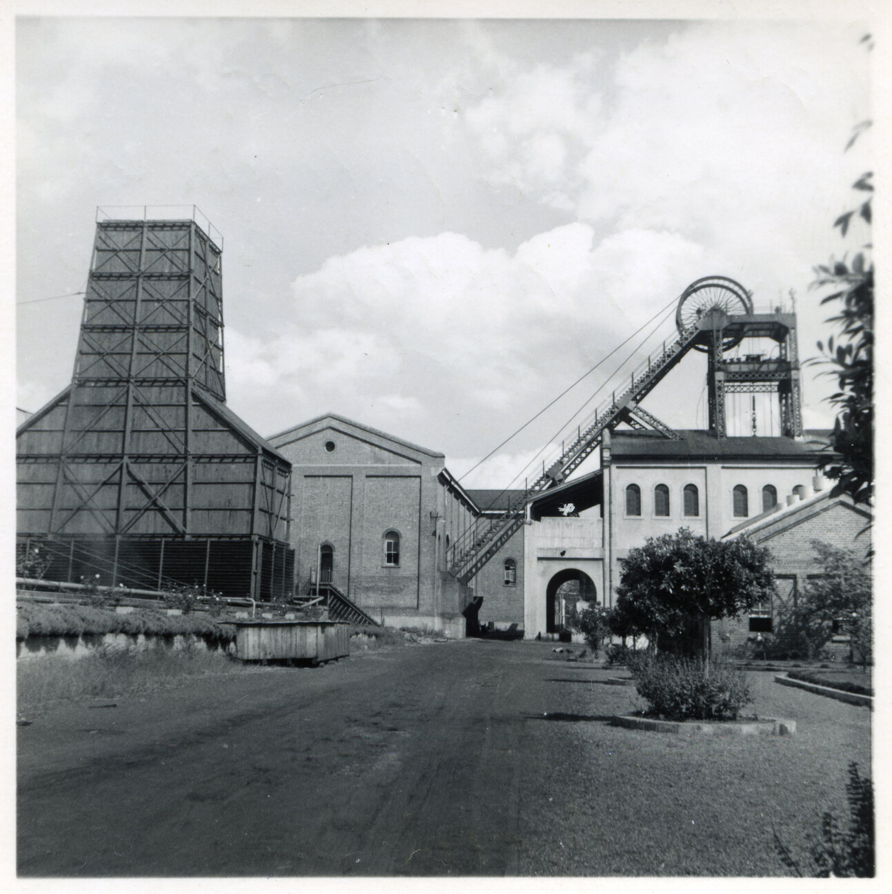 J. & A. Brown & Abermain Seaham Collieries Limited, Richmond Main Colliery. (L-R) Water Cooling Tower, Power House (wherein is winding motor), Pit Top Building and Poppit Head. [c.1960s] (c.1960s), [A7722 (xxviii)-01 (recto & verso)]. Living Histories, accessed 18/03/2026, https://livinghistories.newcastle.edu.au/nodes/view/119236