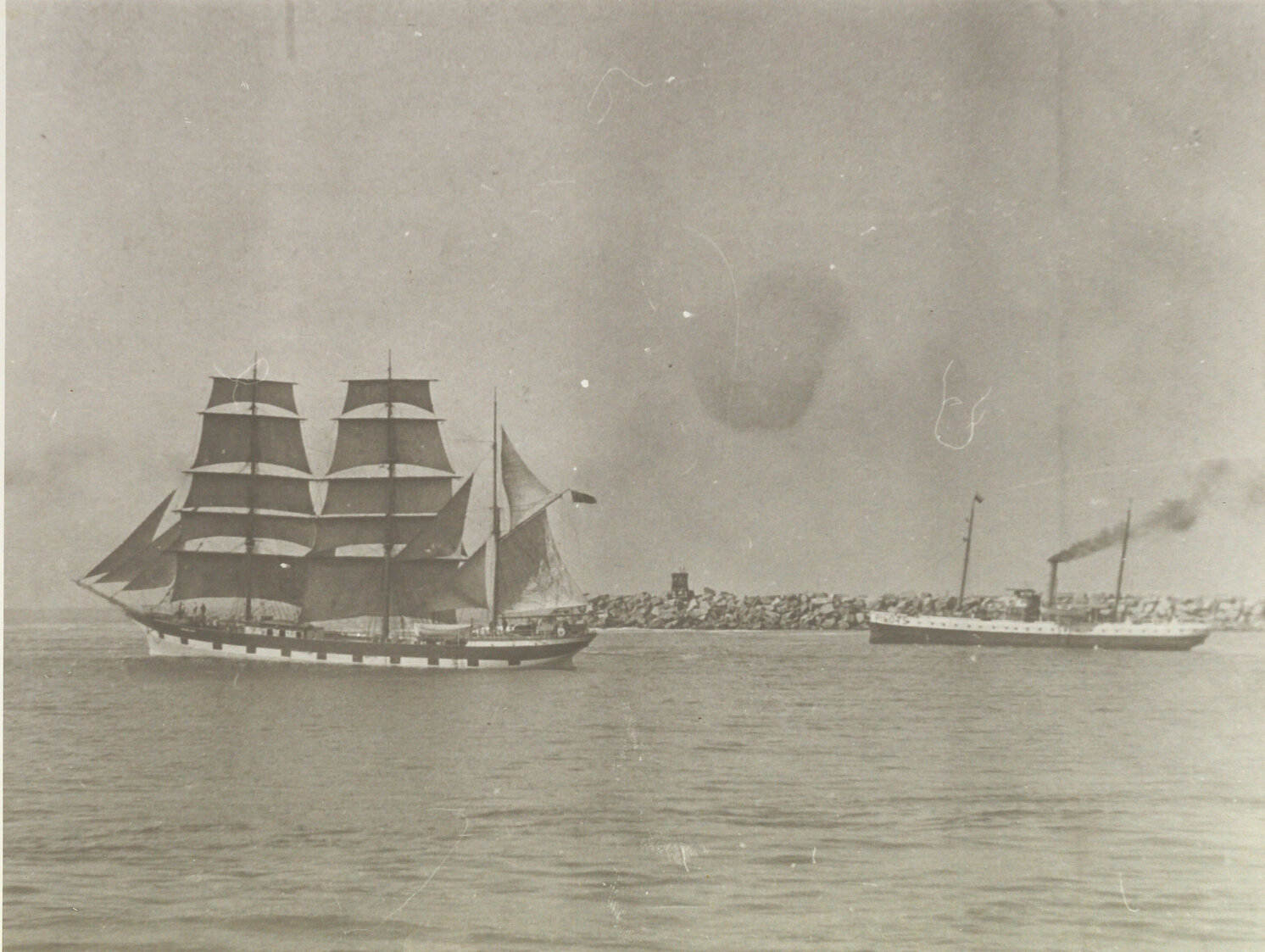 Bert Lovett Collection, Newcastle Maritime Museum, Unidentified Sailship with Pilot Boat 'Ajax' at Entrance to Newcastle Harbour, [000-015-069]. Living Histories, accessed 12/04/2026, https://livinghistories.newcastle.edu.au/nodes/view/119319