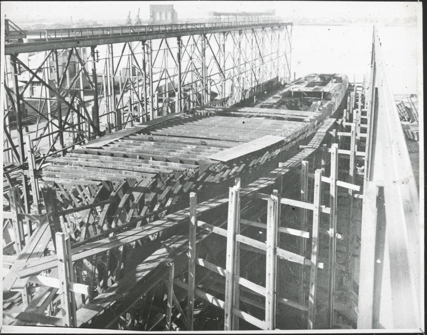 Newcastle State Dockyard, J. Price, Ship Under Construction in Slipway, [2008-245-24]. Living Histories, accessed 24/04/2026, https://livinghistories.newcastle.edu.au/nodes/view/119424