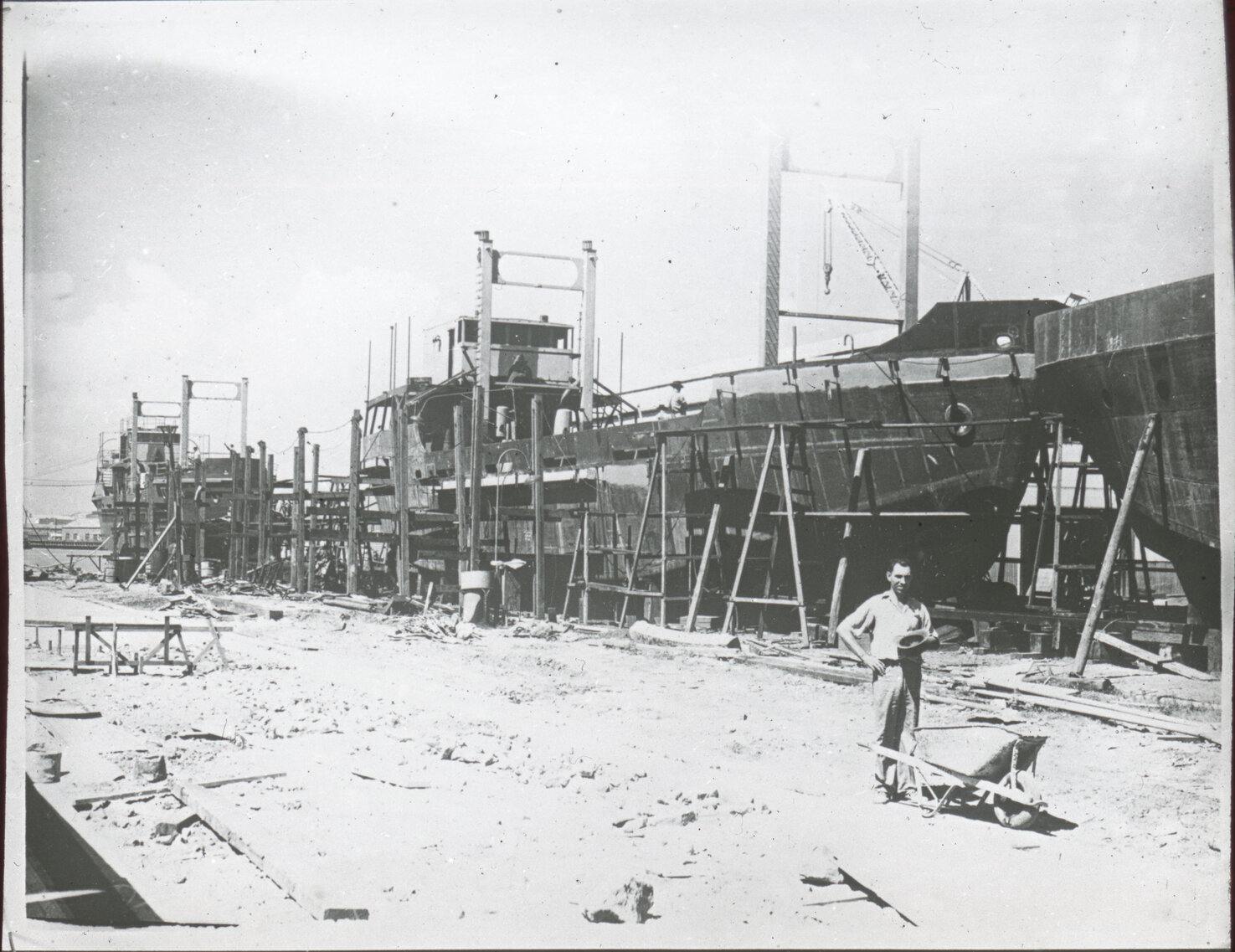Newcastle State Dockyard, J. Price, Ships under Construction at Newcastle State Dockyard, [2008-245-26]. Living Histories, accessed 24/04/2026, https://livinghistories.newcastle.edu.au/nodes/view/119426