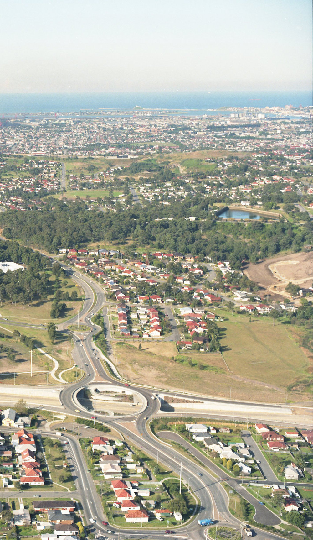 An aerial view of the roundabout on State Highway 23 that is situated near the University of Newcastle, Australia - 1992 (1992), [B16366-92.83.10]. Living Histories, accessed 20/03/2026, https://livinghistories.newcastle.edu.au/nodes/view/12119