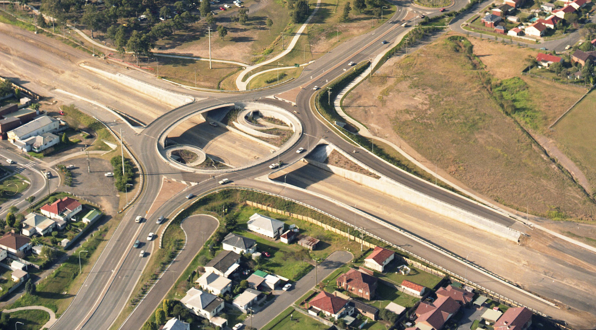 An aerial view of the roundabout on State Highway 23 that is situated near the University of Newcastle, Australia - 1992 (1992), [B16366-92.84.2]. Living Histories, accessed 18/02/2026, https://livinghistories.newcastle.edu.au/nodes/view/12123