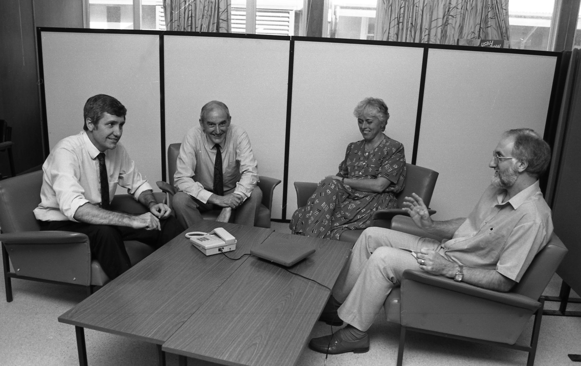 Dr John Schiller (far left) and Dr Roy Killen (far right) with two unidentified academics, the University of Newcastle, Australia - 1992 (1992), [B16364-92.41-15]. Living Histories, accessed 16/04/2026, https://livinghistories.newcastle.edu.au/nodes/view/13051