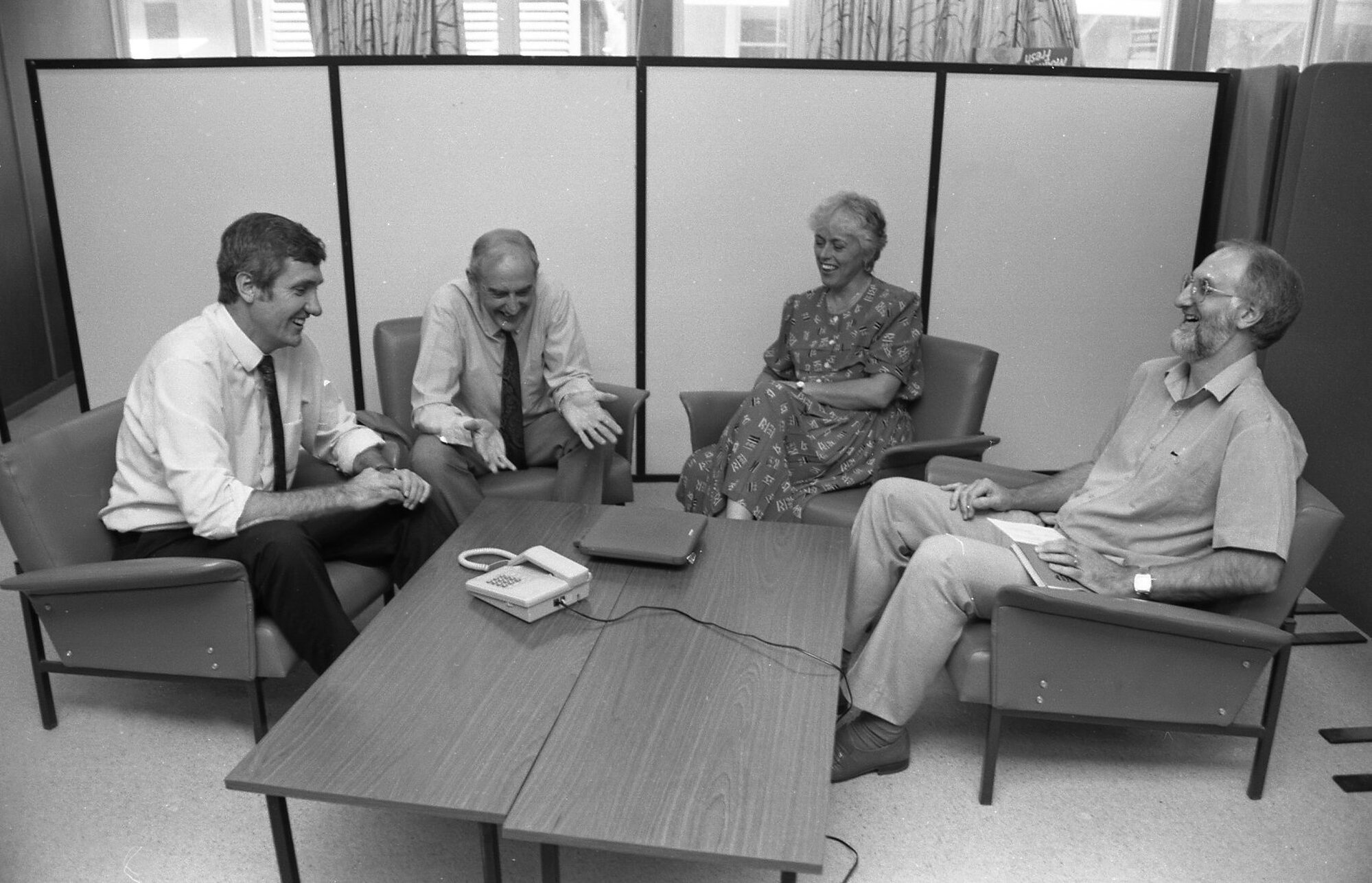 Dr John Schiller (far left) and Dr Roy Killen (far right) with two unidentified academics, the University of Newcastle, Australia - 1992 (1992), [B16364-92.41-13]. Living Histories, accessed 09/03/2026, https://livinghistories.newcastle.edu.au/nodes/view/13052