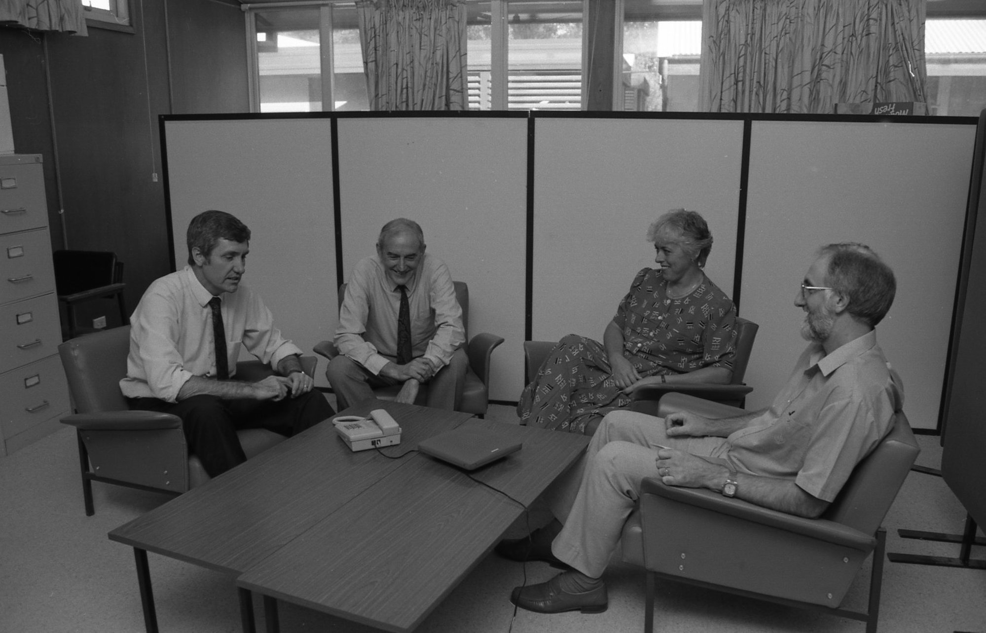 Dr John Schiller (far left) and Dr Roy Killen (far right) with two unidentified academics, the University of Newcastle, Australia - 1992 (1992), [B16364-92.41-9]. Living Histories, accessed 06/03/2026, https://livinghistories.newcastle.edu.au/nodes/view/13054