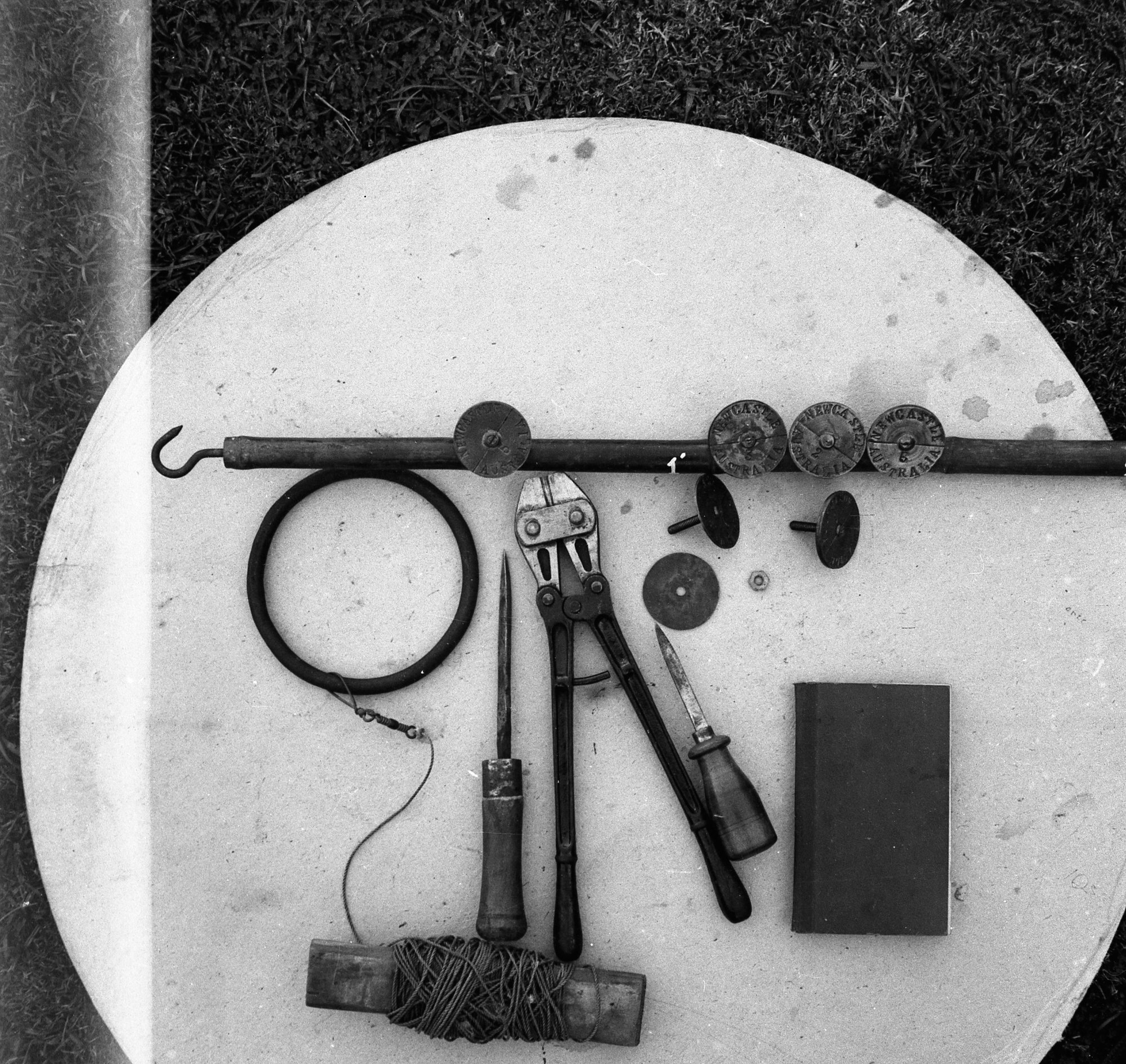 D'Ombrain, Athel, 1901-1985, Trawling with Jimmy Hill's Boat 'Duncan' [1940s] - The first type of brass tail tags made for Athel D’Ombrain for tagging and releasing marlin (1940's), [B10405-N2206]. Living Histories, accessed 20/01/2026, https://livinghistories.newcastle.edu.au/nodes/view/13100