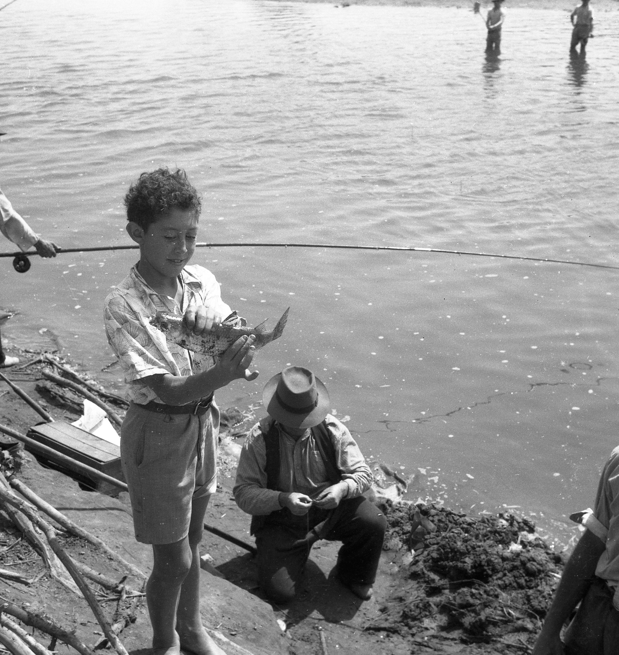 D'Ombrain, Athel, 1901-1985, Two fishermen and a boy with mullet near Belmore Bridge, Maitland, NSW, [B10404-N2034]. Living Histories, accessed 25/01/2026, https://livinghistories.newcastle.edu.au/nodes/view/13285