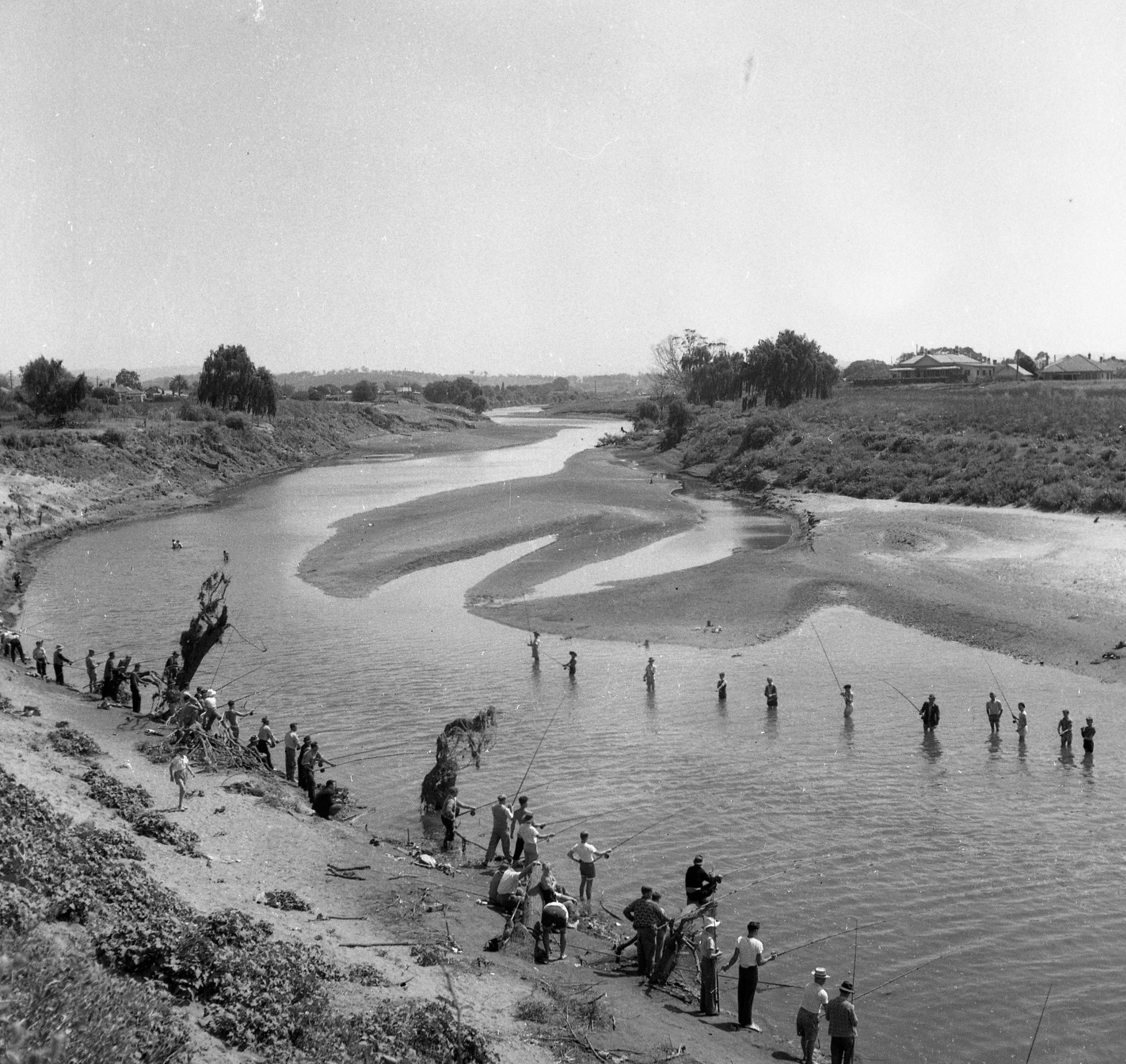 Crowd fishing for mullet at Belmore Bridge, Hunter River, NSW