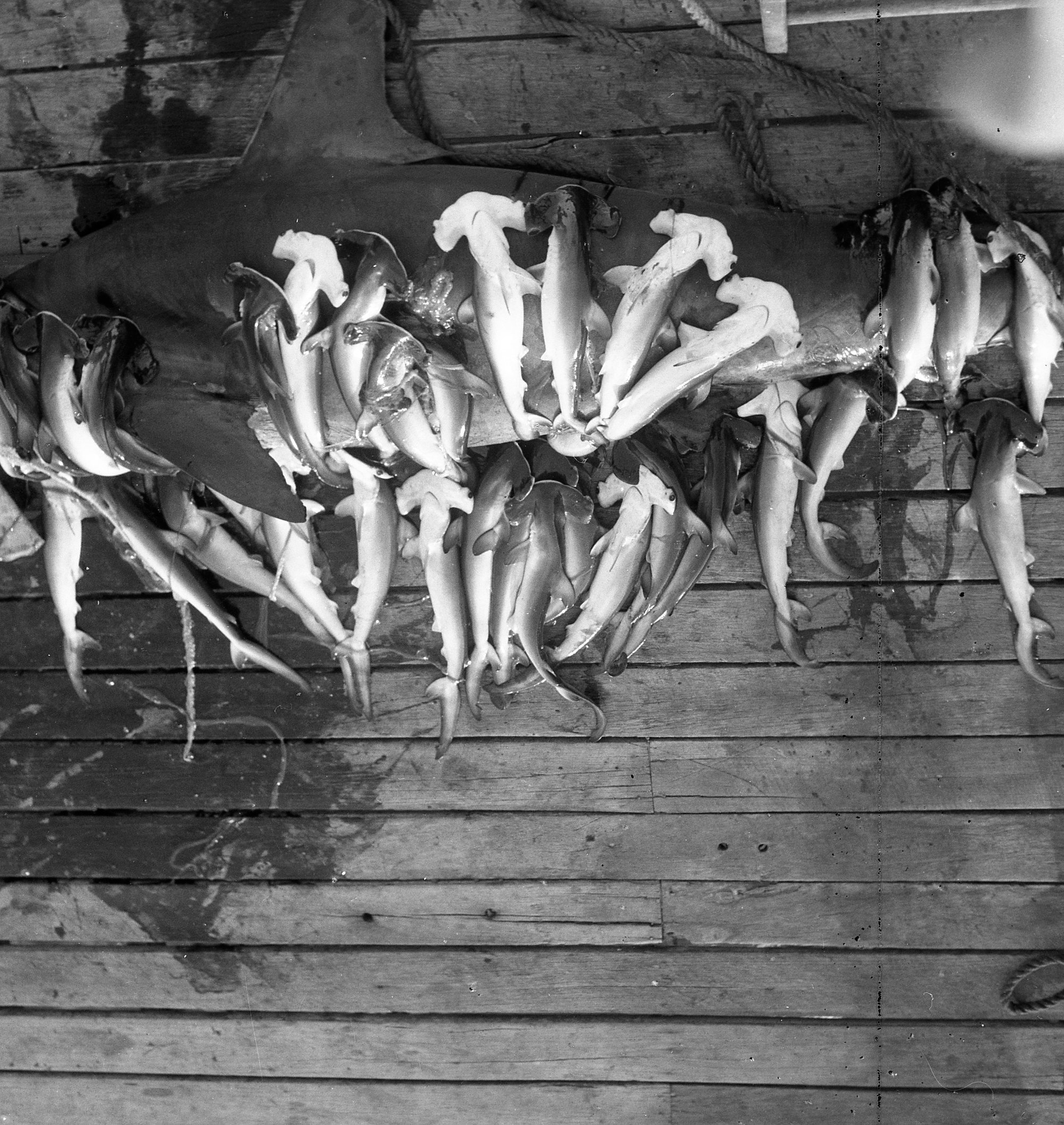 D'Ombrain, Athel, 1901-1985, 500lb hammer-head shark with some of the 40 young born on the deck after the shark was caught, [B10403-N1850]. Living Histories, accessed 16/01/2026, https://livinghistories.newcastle.edu.au/nodes/view/13461