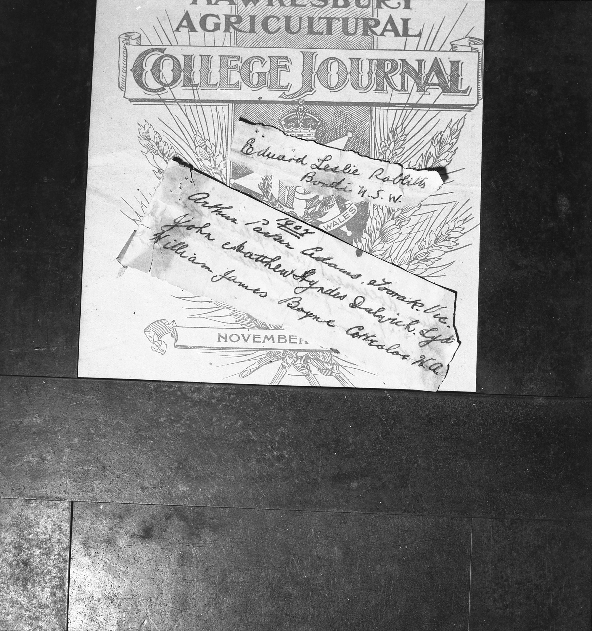 Documents with students’ names found in the ceiling at Hawkesbury Agricultural College during ‘initiation’ ceremonies at the College in 1921