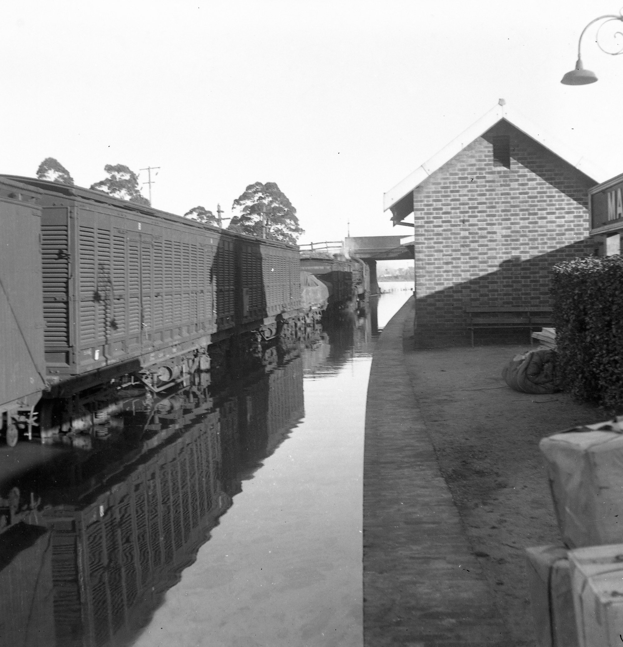 D'Ombrain, Athel, 1901-1985, Maitland Flood, 1955 - Train at Maitland Station (1955), [B10403-N1685]. Living Histories, accessed 17/02/2026, https://livinghistories.newcastle.edu.au/nodes/view/13618