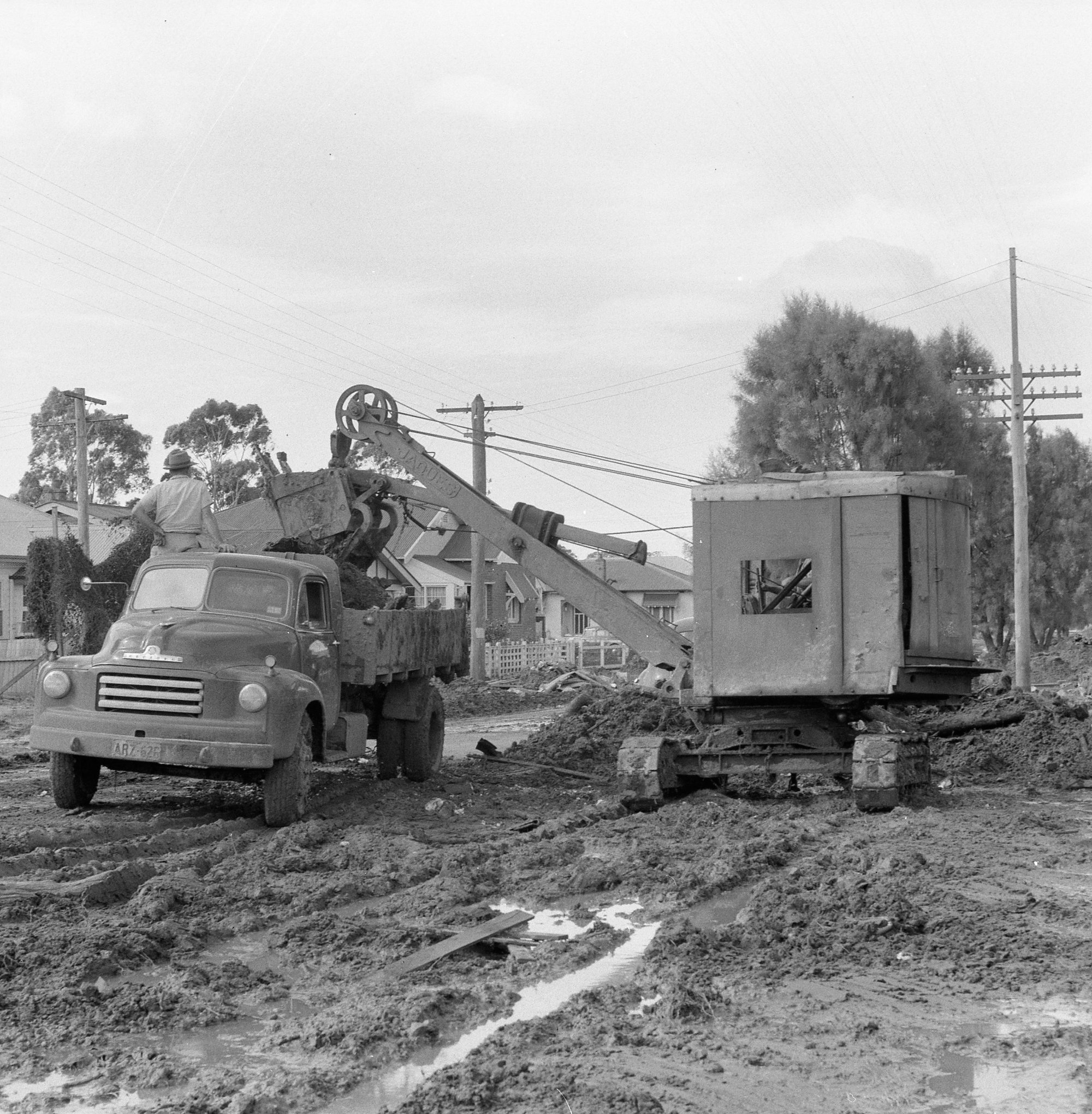 Maitland Flood, 1955 - Dragline tipping a load of debris on to a truck