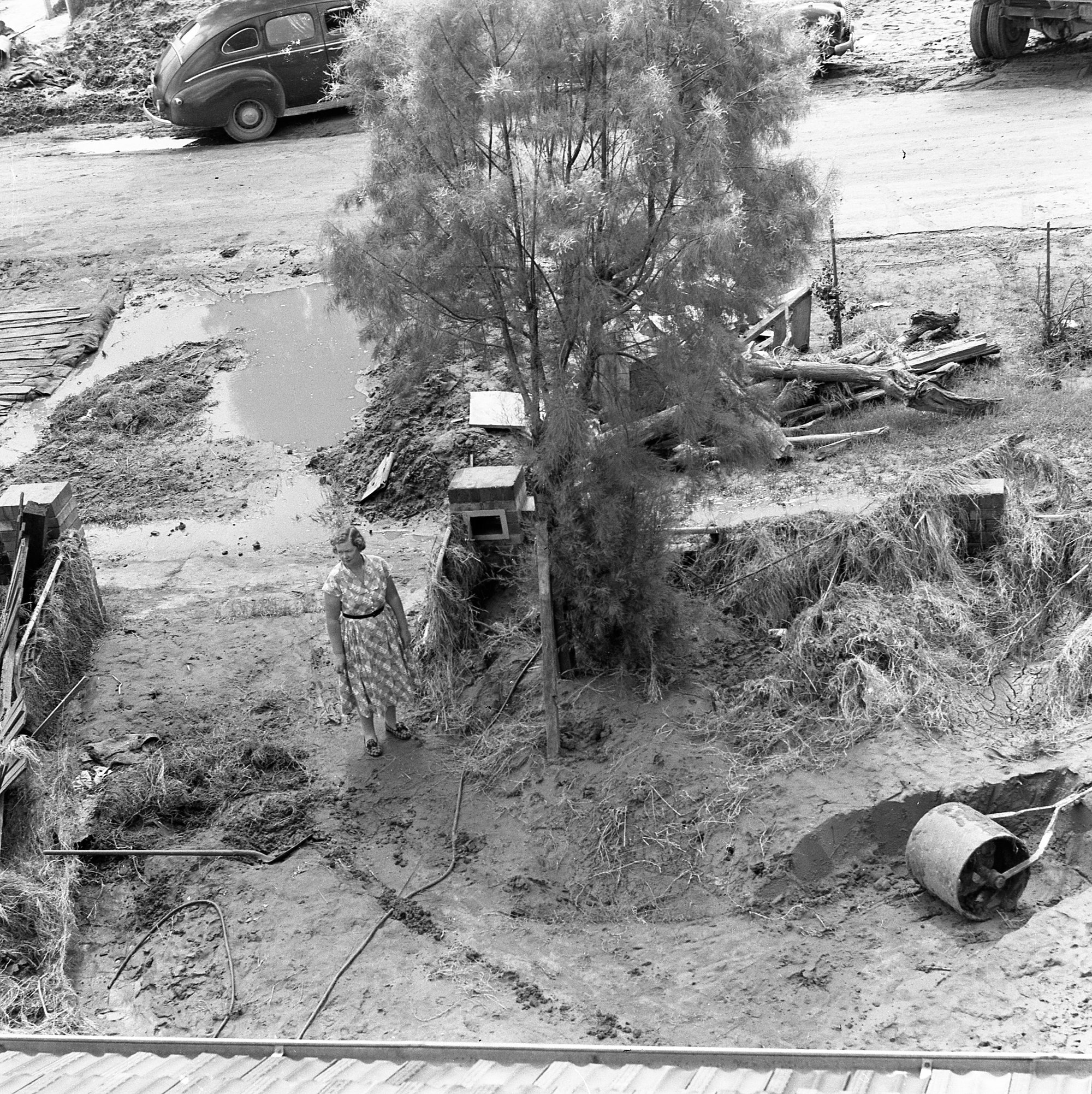 D'Ombrain, Athel, 1901-1985, Maitland Flood, 1955 - Esma D’Ombrain at front gate of house in Nillo Street (1955), [B10403-N1673]. Living Histories, accessed 05/04/2026, https://livinghistories.newcastle.edu.au/nodes/view/13630