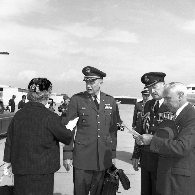 Air Vice marshal, W.E. Townsend, Williamtown meeting General Powell on the anniversary of Coral Sea Week - Townsend on right, 1 May 1961