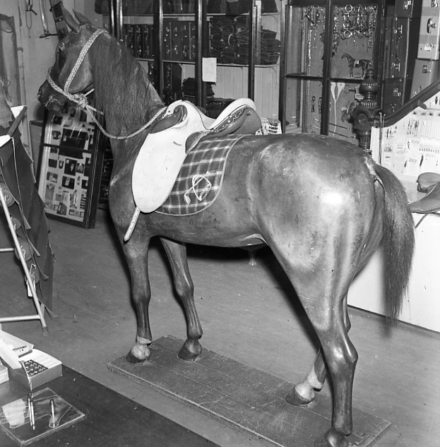 Statue of a horse at Rourkes Saddle Shop - (statue now in South Australia), photograph 1956