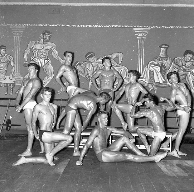 D'Ombrain, Athel, 1901-1985, Men performing for the final night of judging for the Mr. Hunter Valley title at the Maitland Adonis Club, NSW [n.d.], [B10400-N0900]. Living Histories, accessed 20/01/2026, https://livinghistories.newcastle.edu.au/nodes/view/14389