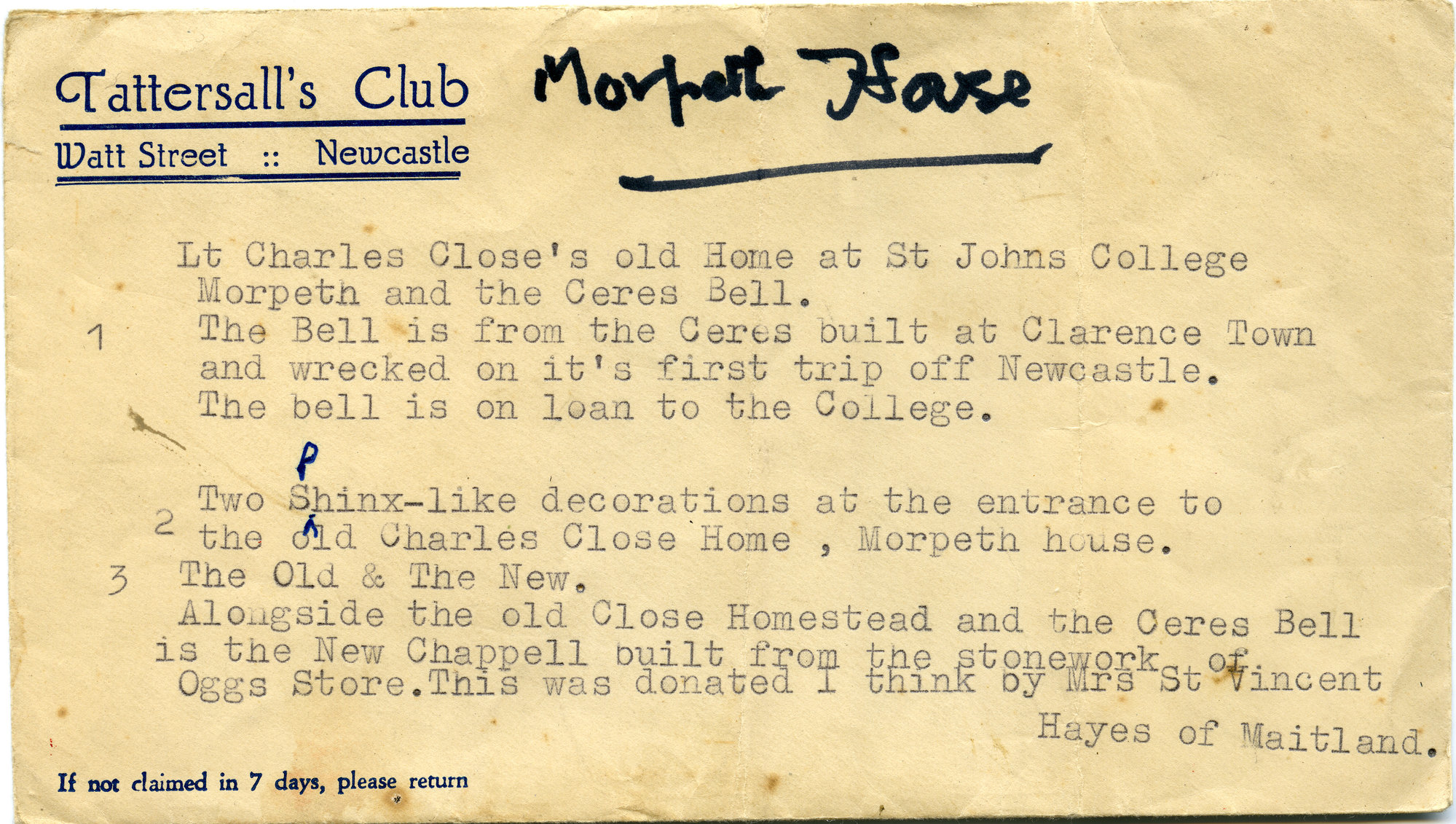 D'Ombrain, Athel, 1901-1985, Text on Tattersall's Club letterhead, (Watt Street, Newcastle) relating to Morpeth House, Morpeth, NSW, [B10398-N0495]. Living Histories, accessed 05/04/2026, https://livinghistories.newcastle.edu.au/nodes/view/14762