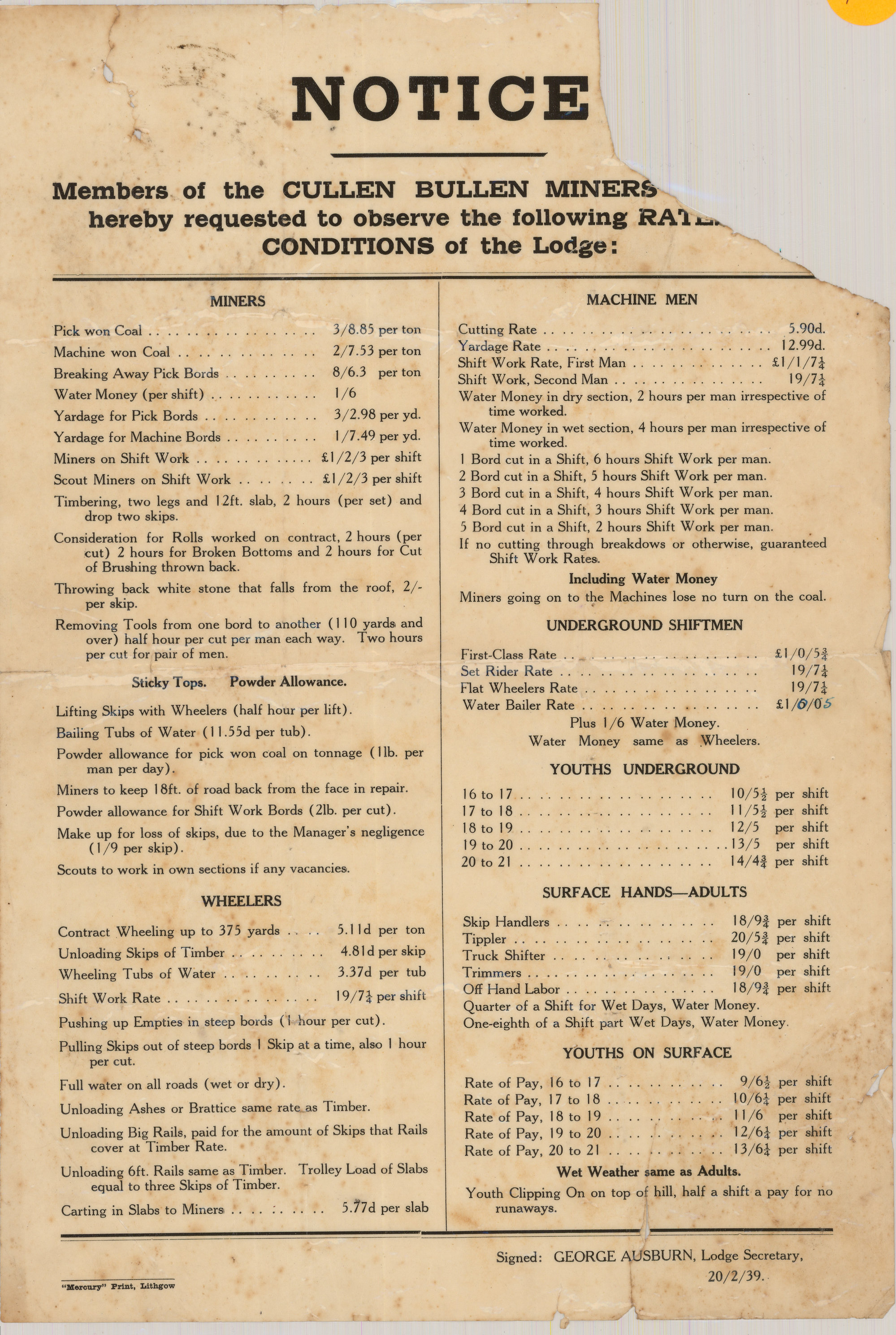 Notice to Miners, Cullen Bullen, 20 February 1939 (1939-02-20), [CC403]. Living Histories, accessed 10/02/2026, https://livinghistories.newcastle.edu.au/nodes/view/1480