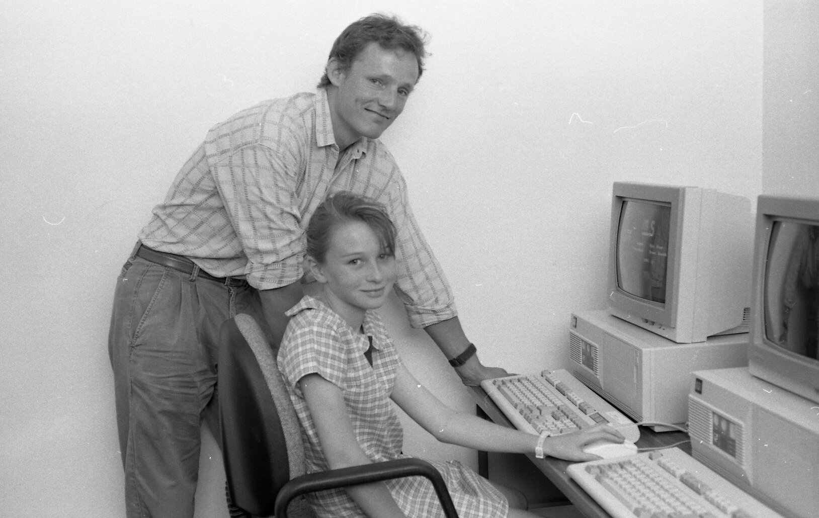Rick Frost (Special Education) assists a child at a computer, the University of Newcastle, Australia - 1992