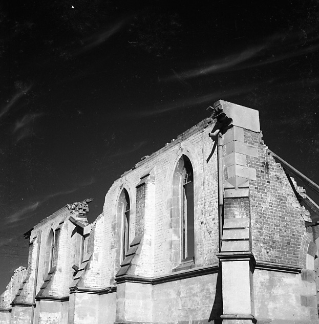 D'Ombrain, Athel, 1901-1985, Methodist Church during demolition, Morpeth, NSW, [1970] ([1970]), [B10397-N0237]. Living Histories, accessed 15/02/2026, https://livinghistories.newcastle.edu.au/nodes/view/15167