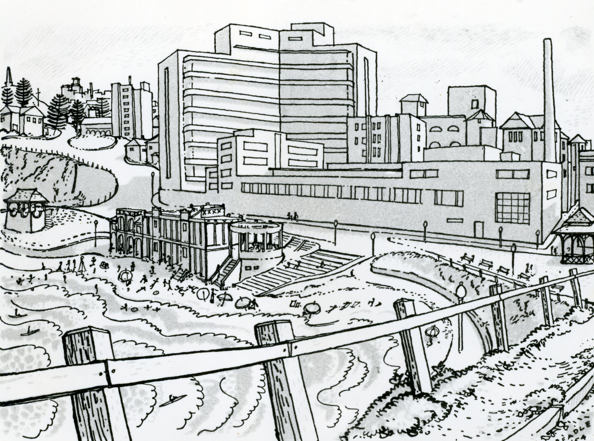 Sketch of the Royal Newcastle Hospital, looking south west over Newcastle Beach and Pavilion towards the Nickson Wing, NSW, [A9012(lxix)pp]. Living Histories, accessed 16/04/2026, https://livinghistories.newcastle.edu.au/nodes/view/15294