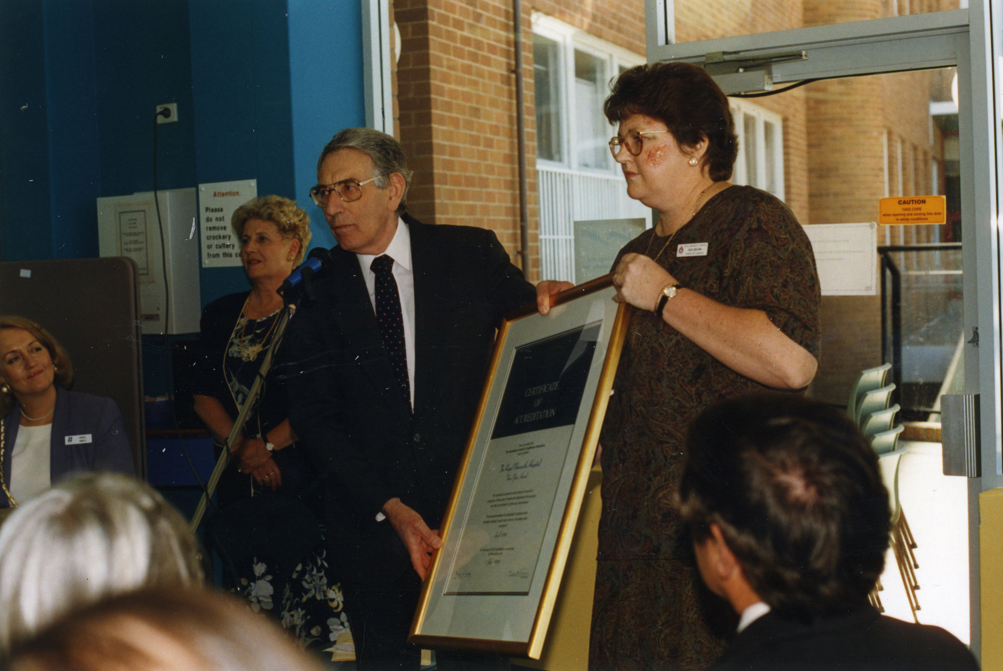 Presenting the accreditation certificate at the Australian Council of Healthcare Standards, ACHS, Royal Newcastle, Hospital, 13 November 1996