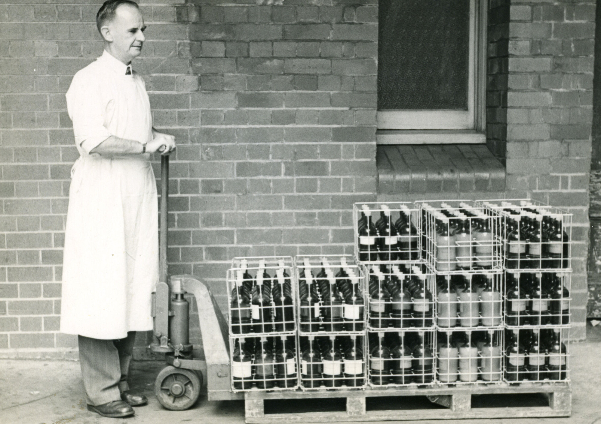 Moving crates of ether sulphate, Royal Newcastle Hospital's Pharmacy, Newcastle, NSW